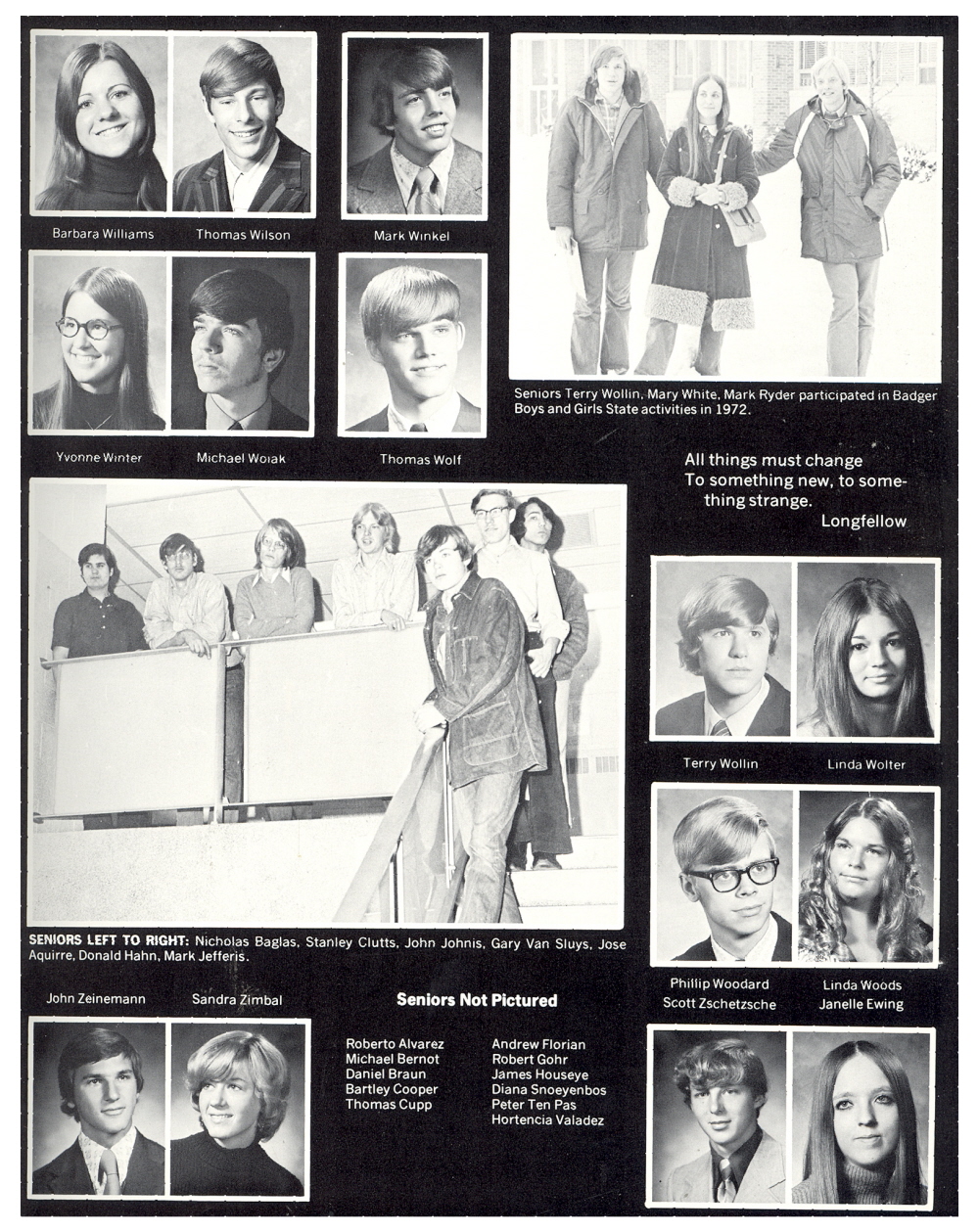 High School, Page 55: Barbara Williams, Thomas Wilson, Mark Winkel, Yvonne Winter, Michael Woiak, Thomas Wolf, Terry Wollin, Linda Wolter, Philip Woodard, Linda Woods, John Zeinemann, Sandra Zimbal, Scott Zschetzsche, Janelle Ewing, Roberto Alvarez, Michael Burnot, Daniel Braun, Bartley Cooper, Thomas Cupp, Andrew Florian, Robert Gohr, James Houseye, Diana Snoeyenbos, Peter Ten Pas, Hortencia Valadez.