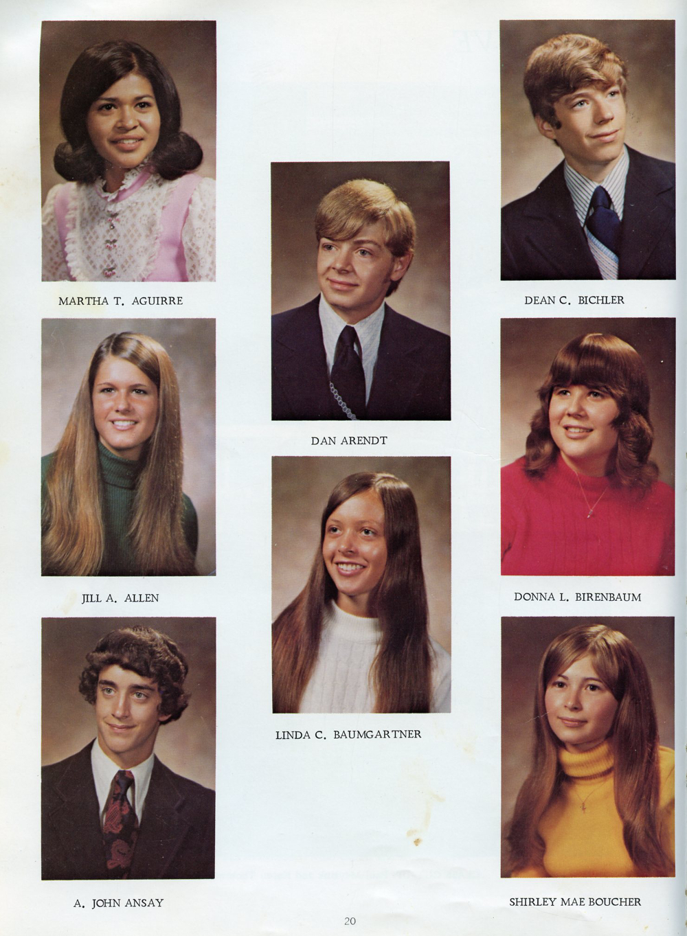 1974 Cedar Grove High School, Page 20: Martha T. Aguirre, Jill A. Allen, A. John Ansay, Dan Arendt, Linda C. Baumgartner, Dean C. Bichler, Donna L. Birenbaum, Shirley Mae Boucher.