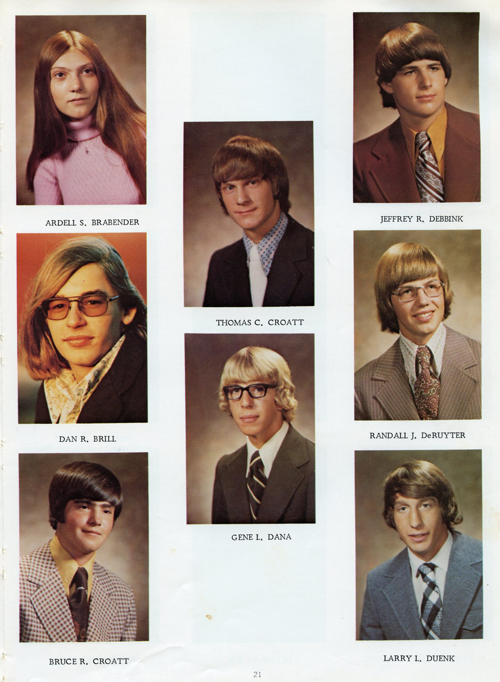 1974 Cedar Grove High School, Page 21: Ardell S. Brabender, Dan R. Brill, Bruce R. Croatt, Thomas C. Croatt, Gene L. Dana, Jeffrey R. Debbink, Randall J. DeRuyter, Larry L. Duenk.