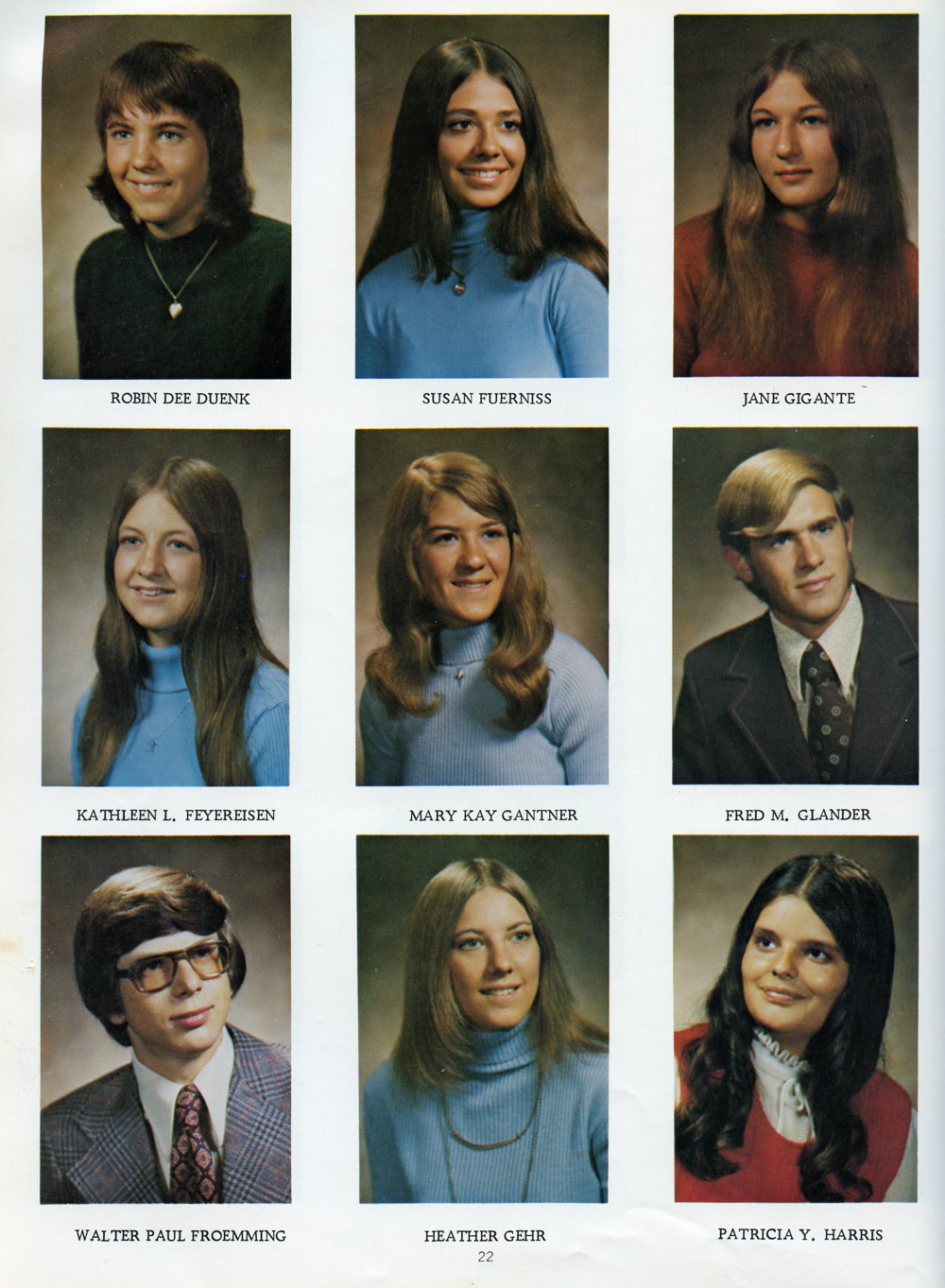 1974 Cedar Grove High School, Page 22: Robin Dee Duenk, Kathleen L. Feyereisen, Walter Paul Froemming, Susan Fuerniss, Mary Kay Gantner, Heather Gehr, Jane Gigante, Fred M. Glander, Patricia Y. Harris.