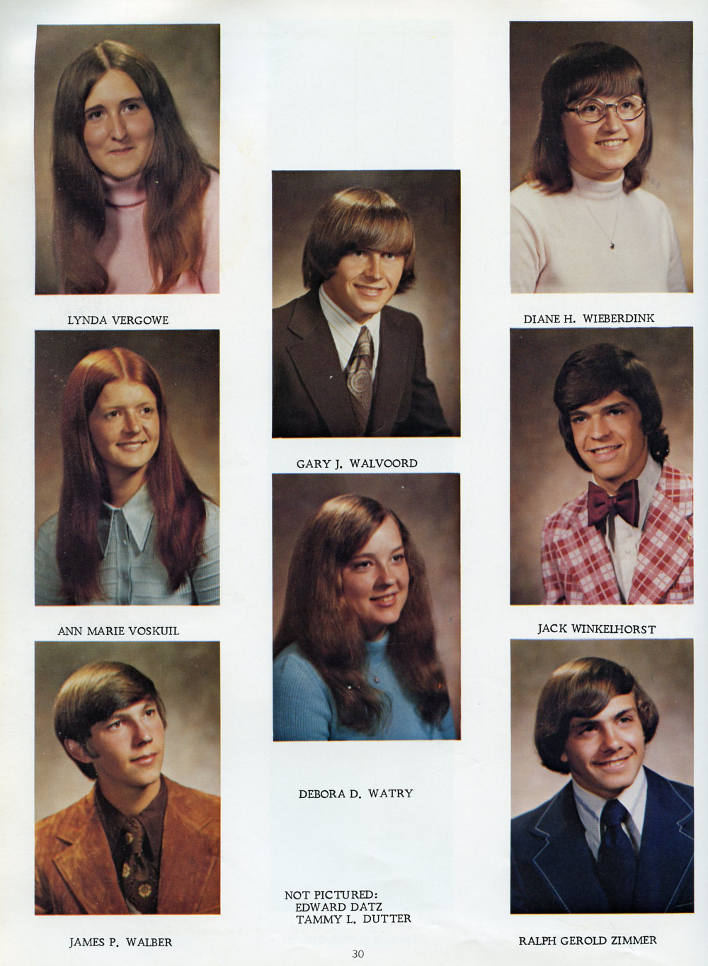 1974 Cedar Grove High School, Page 30: Lynda Vergowe, Ann Marie Voskuil, James P. Walber, Gary J. Walvoord, Debora D. Watry, Diane H. Wieberdink, Jack Winkelhorst, Ralph Gerold Zimmer, Edward Datz, Tammy L. Dutter.