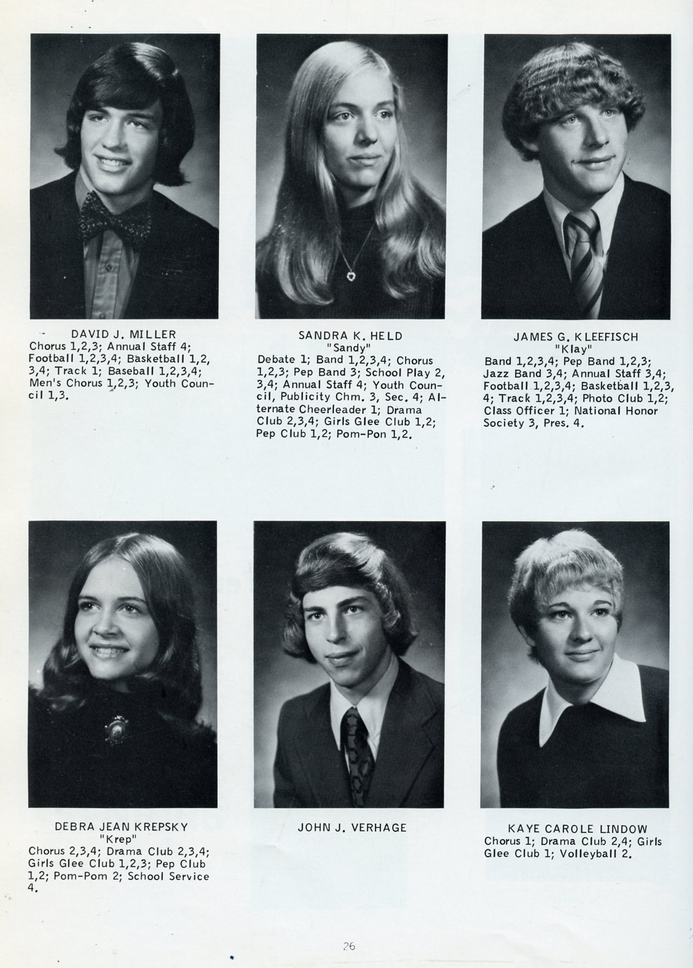 1974 Kohler High School, Page 26: David J. Miller, Sandra K. Held, James G. Kleefisch, Debra Jean Krepsky, John J. Verhage, Kaye Carole Lindow.