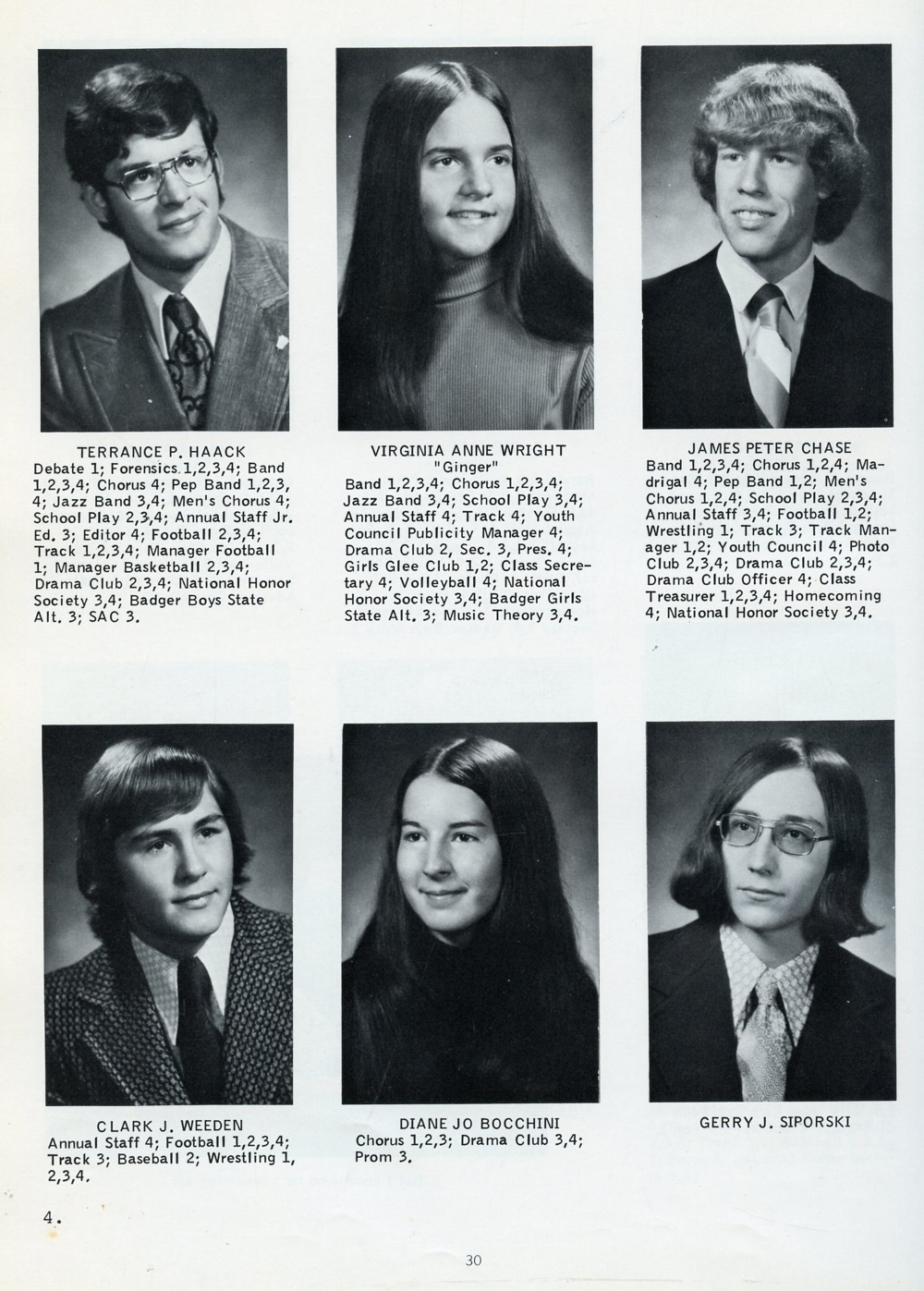1974 Kohler High School, Page 30: Terrance P. Haack, Virginia Anne Wright, James Peter Chase, Clark J. Weeden, Diane Jo Bocchini, Gerry J. Siporski.