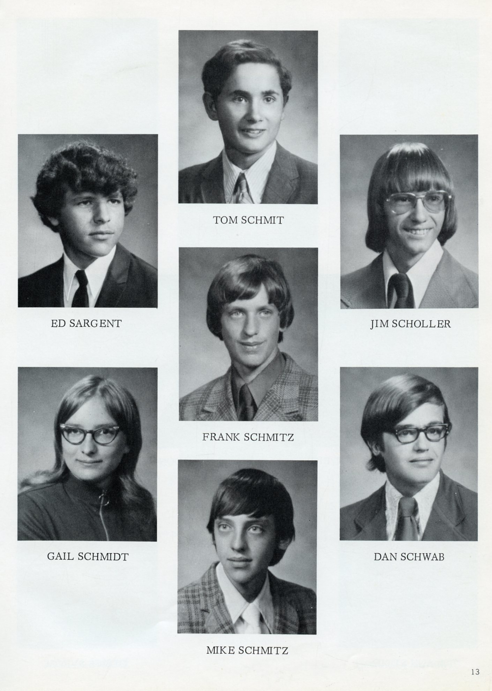 1974 Random Lake High School Yearbook Page 13: Ed Sargent, Gail Schmidt, Tom Schmit, Frank Schmitz, Mike Schmitz, Jim Scholler, Dan Schwab.