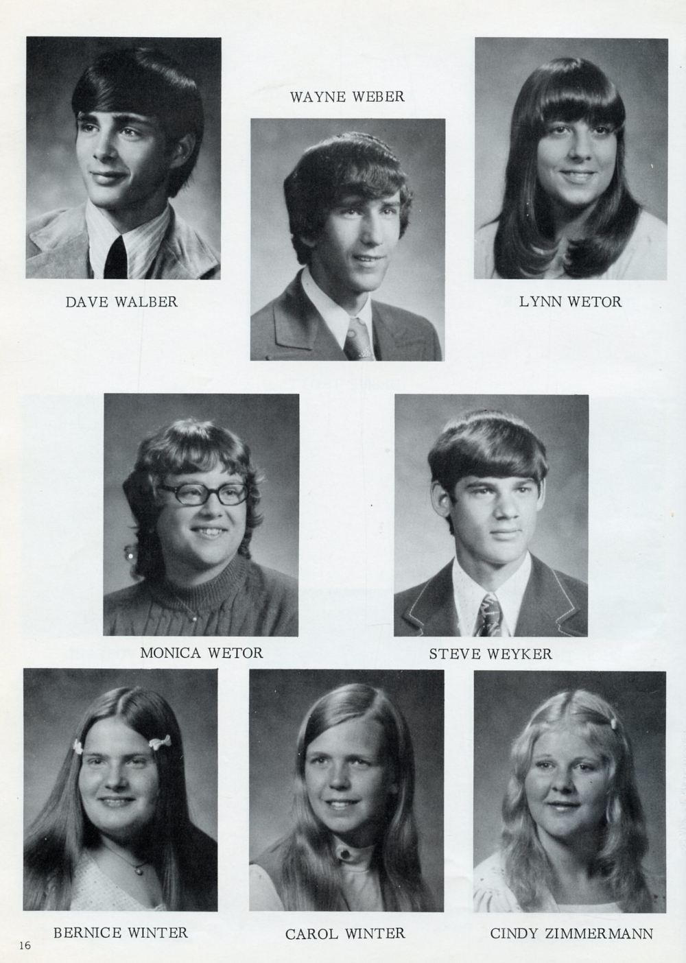 1974 Random Lake High School Yearbook Page 16: Dave Walber, Wayne Weber, Lynn Wetor, Monica Wetor, Steve Weyker, Bernice Winter, Carol Winter, Cindy Zimmermann.