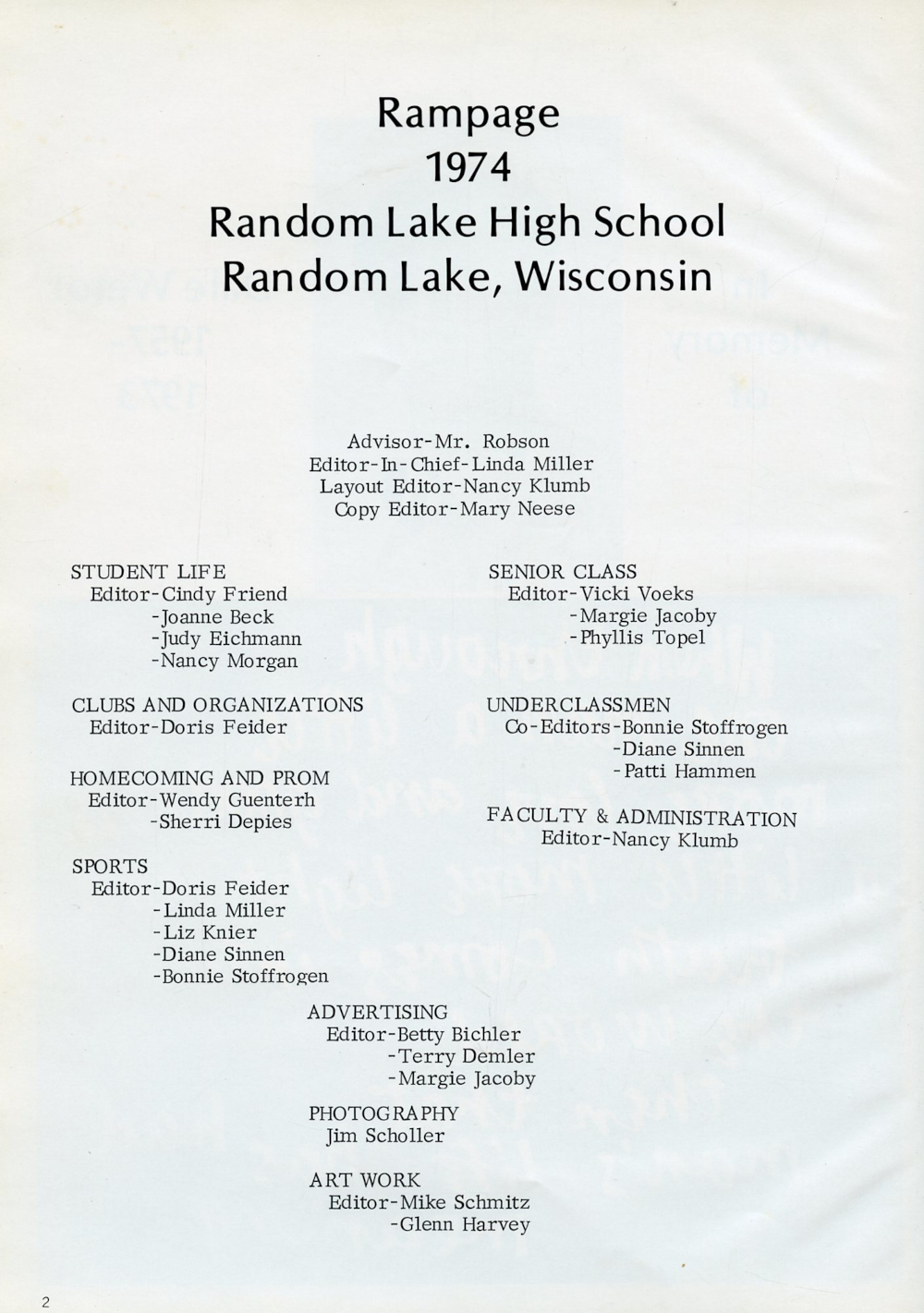 1974 Random Lake High School Yearbook Page 2.