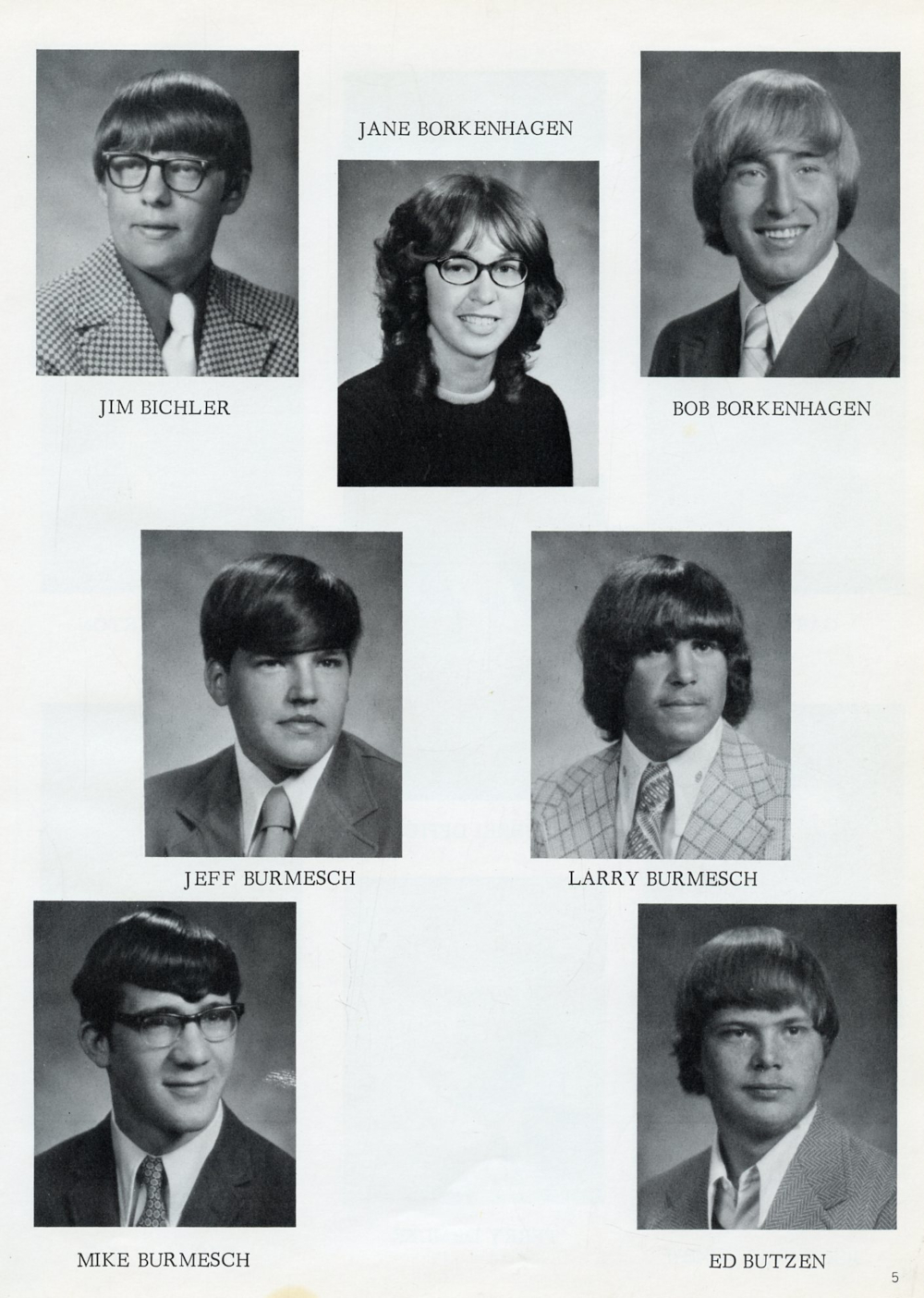 1974 Random Lake High School Yearbook Page 5: Jim Bichler, Jane Borkenhagen, Bob Borkenhagen, Jeff Burmesch, Larry Burmesch, Mike Burmesch, Ed Butzen.