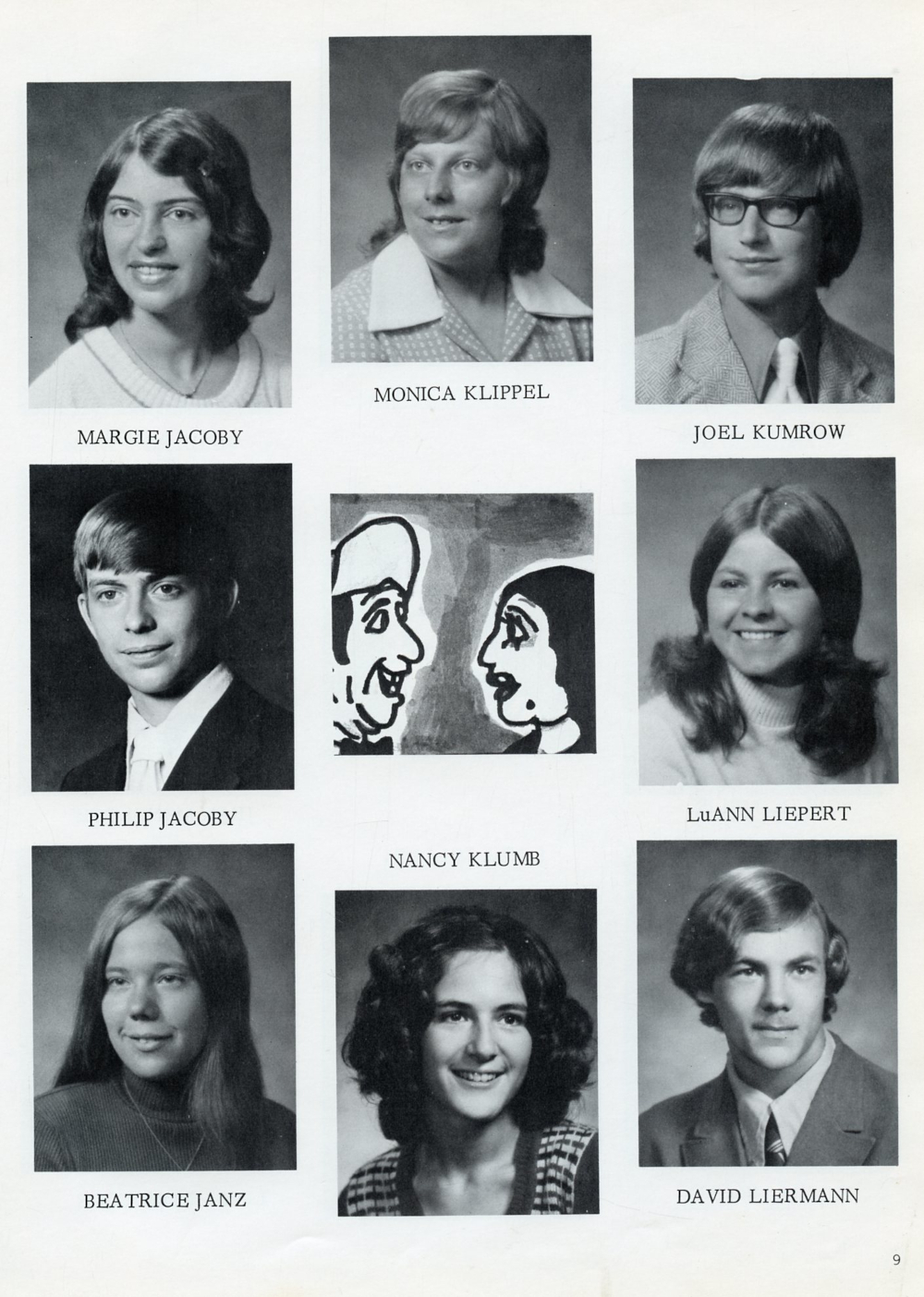 1974 Random Lake High School Yearbook Page 9: Margie Jacoby, Philip Jacoby, Beatrice Janz, Monica Klippel, Nancy Klumb, Joel Kumrow, LuAnn Liepert, David Liermann.