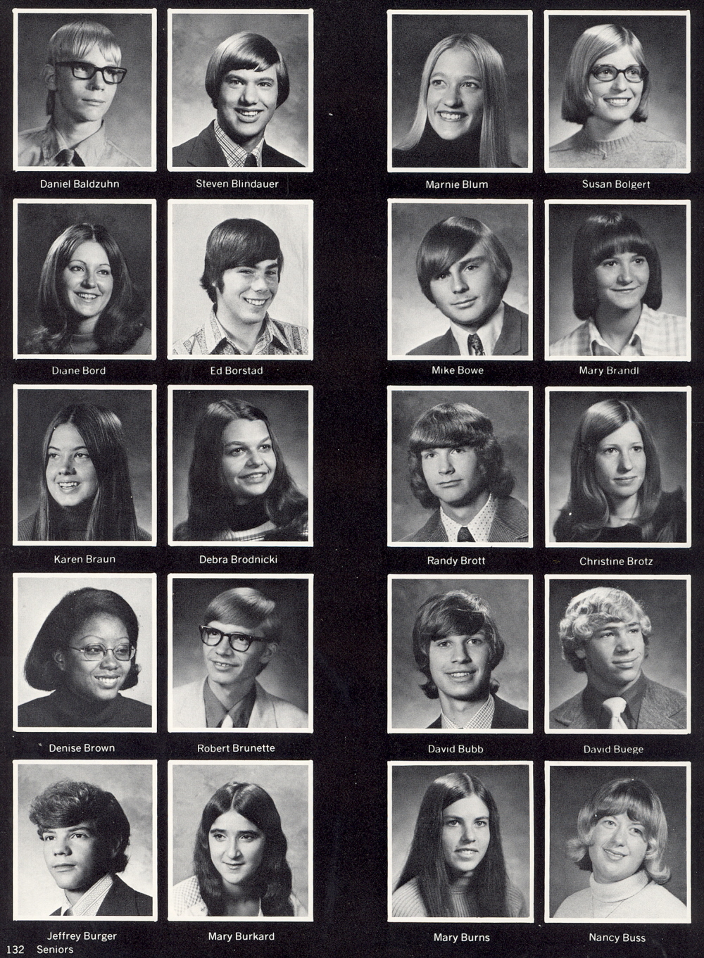 1974 Sheboygan North High School, Page 132: Daniel Baldzuhn, Steven Blindauer, Marnie Blum, Susan Bolgert, Diane Bord, Ed Borstad, Mike Bowe, Mary Brandl, Karen Braun, Debra Brodnicki, Randy Brott, Christine Brotz, Denise Brown, Robert Brunette, David Bubb, David Buege, Jeffrey Burger, Mary Burkard, Mary Burns, Nancy Buss.