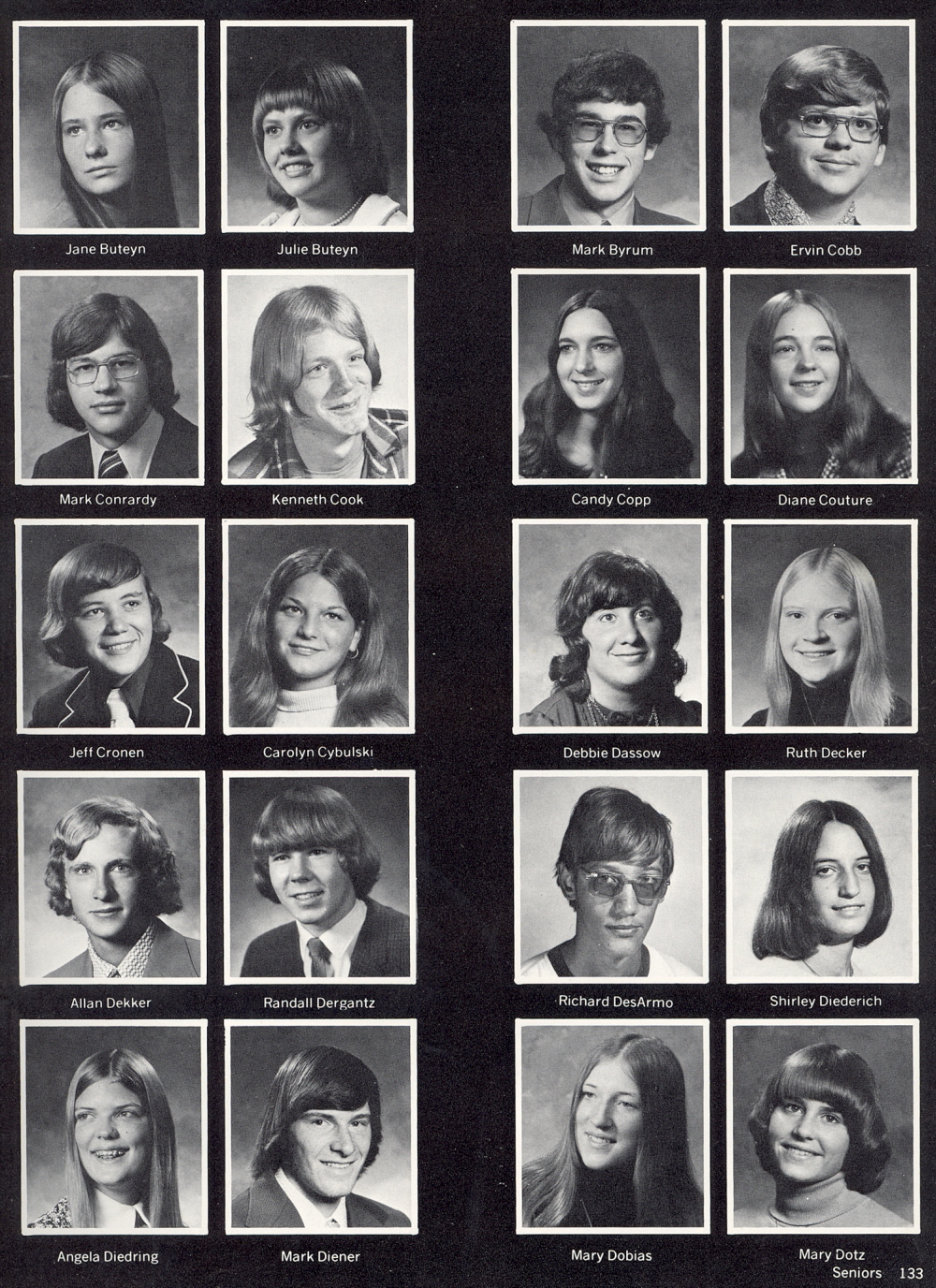 1974 Sheboygan North High School, Page 133: Jane Buteyn, Julie Buteyn, Mark Byrum, Ervin Cobb, Mark Conrardy, Kenneth Cook, Candy Copp, Diane Couture, Jeff Cronen, Carolyn Cybulski, Debbie Dassow, Ruth Decker, Allan Dekker, Randall Dergantz, Richard DesArmo, Shirley Diederich, Angela Diedring, Mark Diener, Mary Dobias, Mary Dotz.