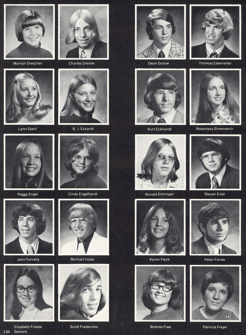 1974 Sheboygan North High School, Page 134: Marilyn Drescher, Charles Drexler, Dean Durow, Thomas Ebenreiter, Lynn Ebert, B. J. Eckardt, Kurt Eckhardt, Rosemary Ehrenreich, Peggy Engel, Cindy Engelhardt, Ronald Entringer, Steven Ertel, John Farrelly, Michael Fasse, Karen Fleck, Peter Flores, Elizabeth Frazee, Scott Fredericks, Brenda Free, Patricia Freye.