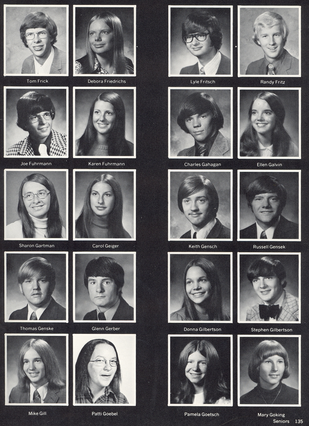 1974 Sheboygan North High School, Page 135: Tom Frick, Debora Friedrichs, Lyle Fritsch, Randy Fritz, Joe Fuhrmann, Karen Fuhrmann, Charles Gahagan, Ellen Galvin, Sharon Gartman, Carol Geiger, Keith Gensch, Russell Gensek, Thomas Genske, Glenn Gerber, Donna Gilbertson, Stephen Gilbertson, Mike Gill, Patti Goebel, Pamela Goetsch, Mary Goking.