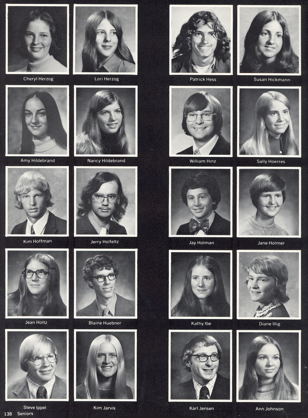 1974 Sheboygan North High School, Page 138: Cheryl Herzog, Lori Herzog, Patrick Hess, Susan Hickmann, Amy Hildebrand, Nancy Hildebrand, William Hinz, Sally Hoerres, Kim Hoffman, Jerry Holfeltz, Jay Holman, Jane Holmer, Jean Holtz, Blaine Huebner, Kathy Ibe, Diane Illig, Steve Ippel, Kim Jarvis, Karl Jensen, Ann Johnson.