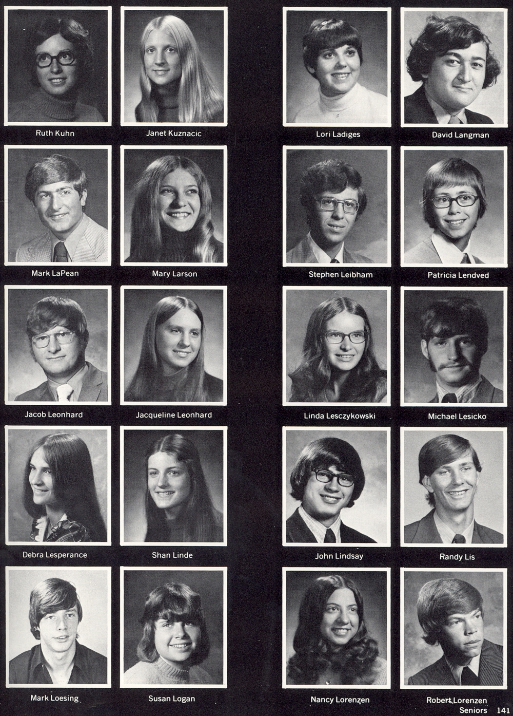 1974 Sheboygan North High School, Page 141: Ruth Kuhn, Janet Kuznacic, Lori Ladiges, David Langman, Mark LaPean, Mary Larson, Stephen Leibham, Patricia Lendved, Jacob Leonhard, Jacqueline Leonhard, Linda Lesczykowski, Michael Lesicko, Debra Lesperance, Shan Linde, John Lindsay, Randy Lis, Mark Loesing, Susan Logan, Nancy Lorenzen, Robert Lorenzen.