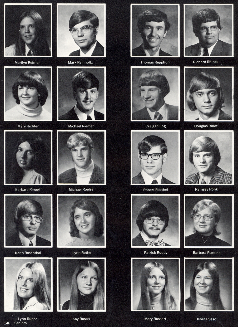 1974 Sheboygan North High School, Page 146: Marilyn Reimer, Mark Reinholtz, Thomas Repphun, Richard Rhines, Mary Richter, Michael Riemer, Craig Rilling, Douglas Rindt, Barbara Ringel, Michael Roelse, Robert Roethel, Ramsey Ronk, Keith Rosenthal, Lynn Rothe, Patrick Ruddy, Barbara Ruesink, Lynn Ruppel, Kay Rusch, Mary Russart, Debra Russo.