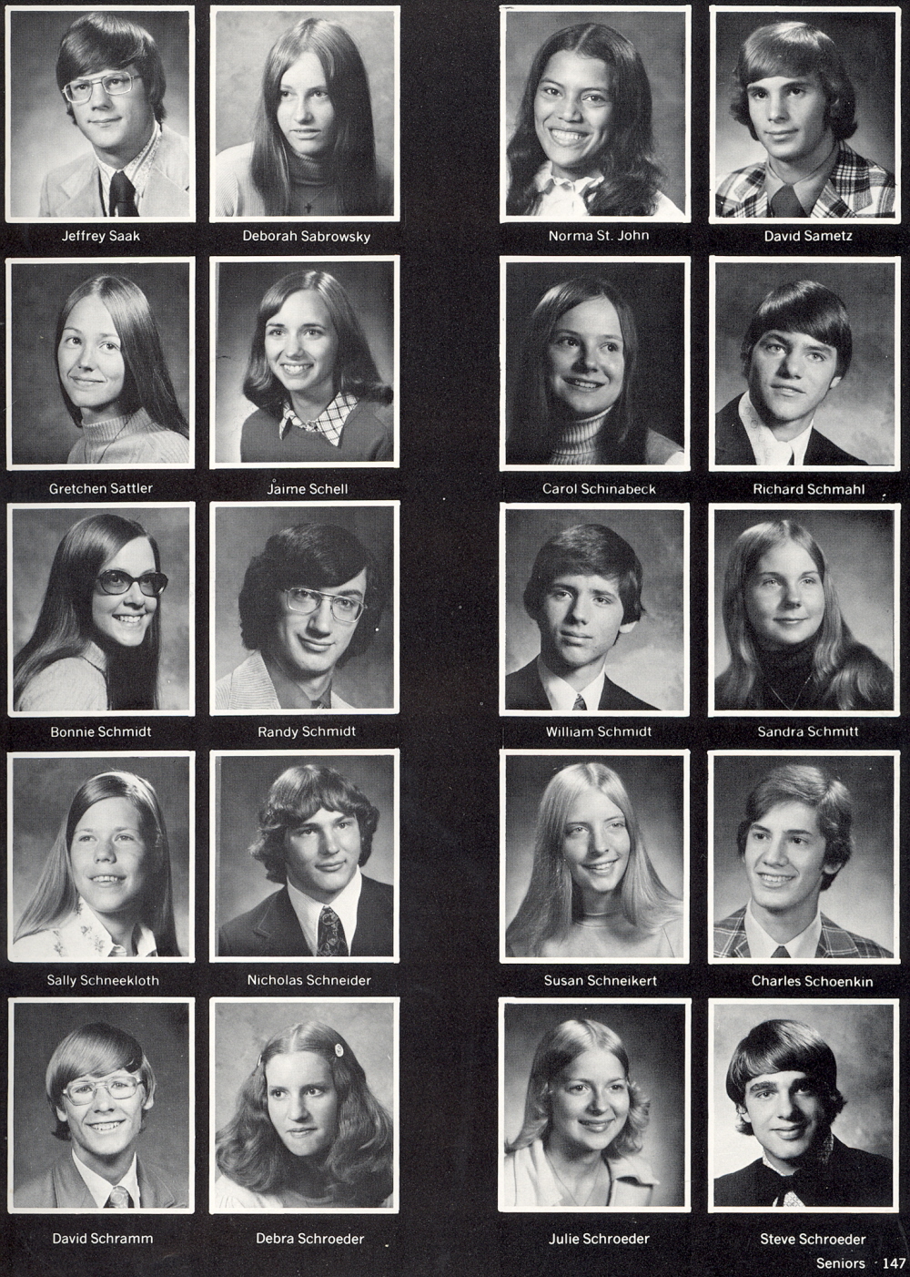 1974 Sheboygan North High School, Page 147: Jeffrey Saak, Deborah Sabrowsky, Norma St. John, David Sametz, Gretchen Sattler, Jaime Schell, Carol Schinabeck, Richard Schmahl, Bonnie Schmidt, Randy Schmidt, William Schmidt, Sandra Schmitt, Sally Schneekloth, Nicholas Schneider, Susan Schneikert, Charles Schoenkin, David Schramm, Debra Schroeder, Julie Schroeder, Steve Schroeder.