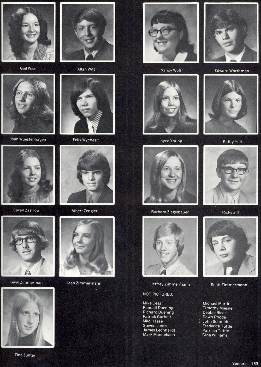 1974 Sheboygan North High School, Page 153: Gail Wise, Allan Witt, Nancy Wolff, Edward Worthman, Joan Wuestenhagen, Felix Wychesit, Joyce Young, Kathy Yull, Caran Zastrow, Albert Zengler, Barbara Ziegelbauer, Ricky Zill, Kevin Zimmerman, Jean Zimmermann, Jeffrey Zimmermann, Scott Zimmermann, Tina Zunter, Mike Cesar, Randall Duening, Richard Duening, Patrick Gurhold, Milo Haase, Steven Jones, James Leonhardt, Mark Mannebach, Michael Martin, Timothy Miesner, Debbie Rieck, Dawn Rhode, John Schmidt, Frederick Tuttle, Patricia Tuttle, Gina Williams.