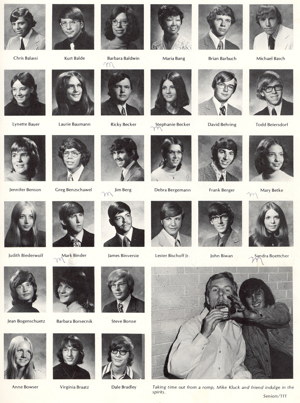 1974 Sheboygan South High School, Page 111: Chris Balassi, Kurt Balde, Barbara Baldwin, Maria Bang, Brian Barbuch, Michael Basch, Lynette Bauer, Laurie Baumann, Ricky Becker, Stephanie Becker, David Behring, Todd Beiersdorf, Jennifer Benson, Greg Benzschawel, Jim Berg, Debra Bergemann, Frank Berger, Mary Betke, Judith Biederwolf, Mark Binder, James Binversie, Lester Bischoff, John Biwan, Sandra Boettcher, Jean Bogenschuetz, Barbara Borsecnik, Steve Borsse, Anne Bowser, Virginia Braatz, Dale Bradley.