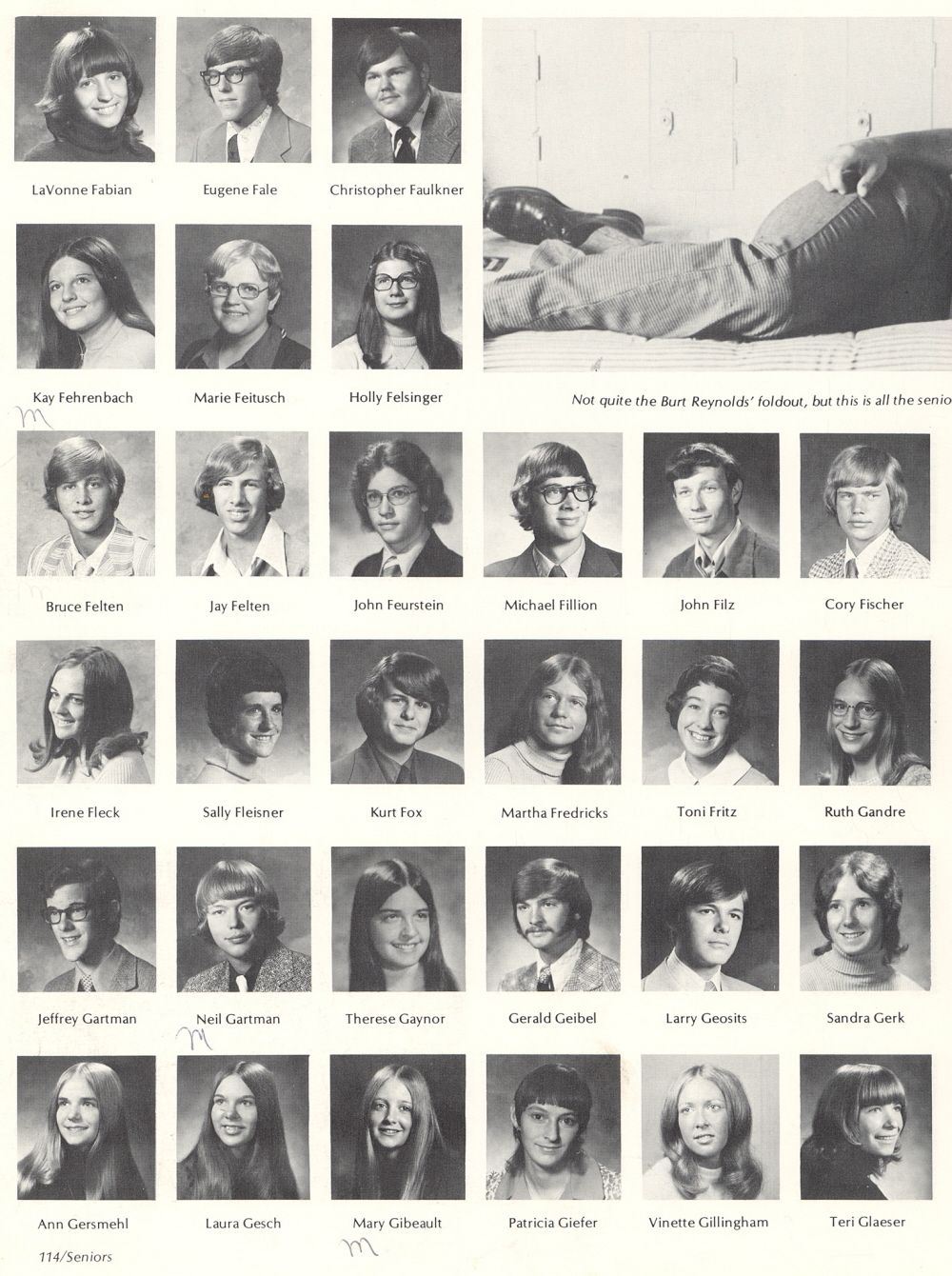 1974 Sheboygan South High School, Page 114: LaVonne Fabian, Eugene Fale, Christopher Faulkner, Kay Fehrenbach, Marie Feitusch, Holly Felsinger, Bruce Felten, Jay Felten, John Feurstein, Michael Fillion, John Filz, Cory Fischer, Irene Fleck, Sally Fleisner, Kurt Fox, Martha Fredricks, Toni Fritz, Ruth Gandre, Jeffrey Gartman, Neil Gartman, Therese Gaynor, Gerald Geibel, Larry Geositis, Sandra Gerk, Ann Gersmehl, Laura Gesch, Mary Gibeault, Patricia Giefer, Vinette Gillingham, Teri Glaeser.
