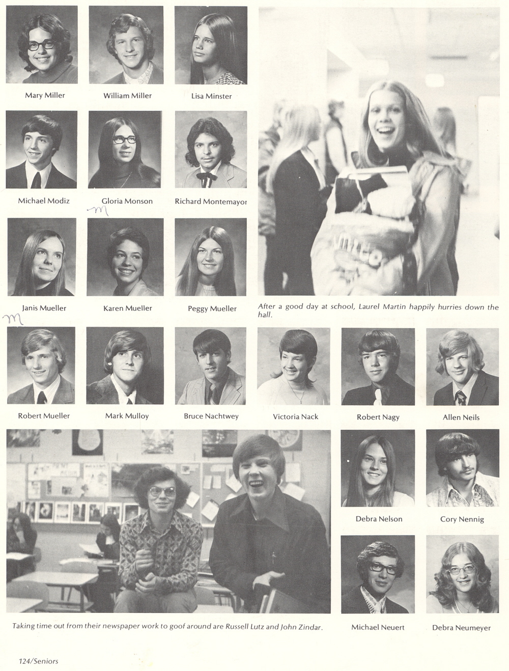 1974 Sheboygan South High School, Page 124: Mary Miller, William Miller, Lisa Minster, Michael Modiz, Gloria Monson, Richard Montemayor, Janis Mueller, Karen Mueller, Peggy Mueller, Robert Mueller, Mark Mulloy, Bruce Nachtwey, Victoria Nack, Robert Nagy, Allen Neils, Debra Nelson, Cory Nennig, Michael Neuert, Debra Neumeyer.