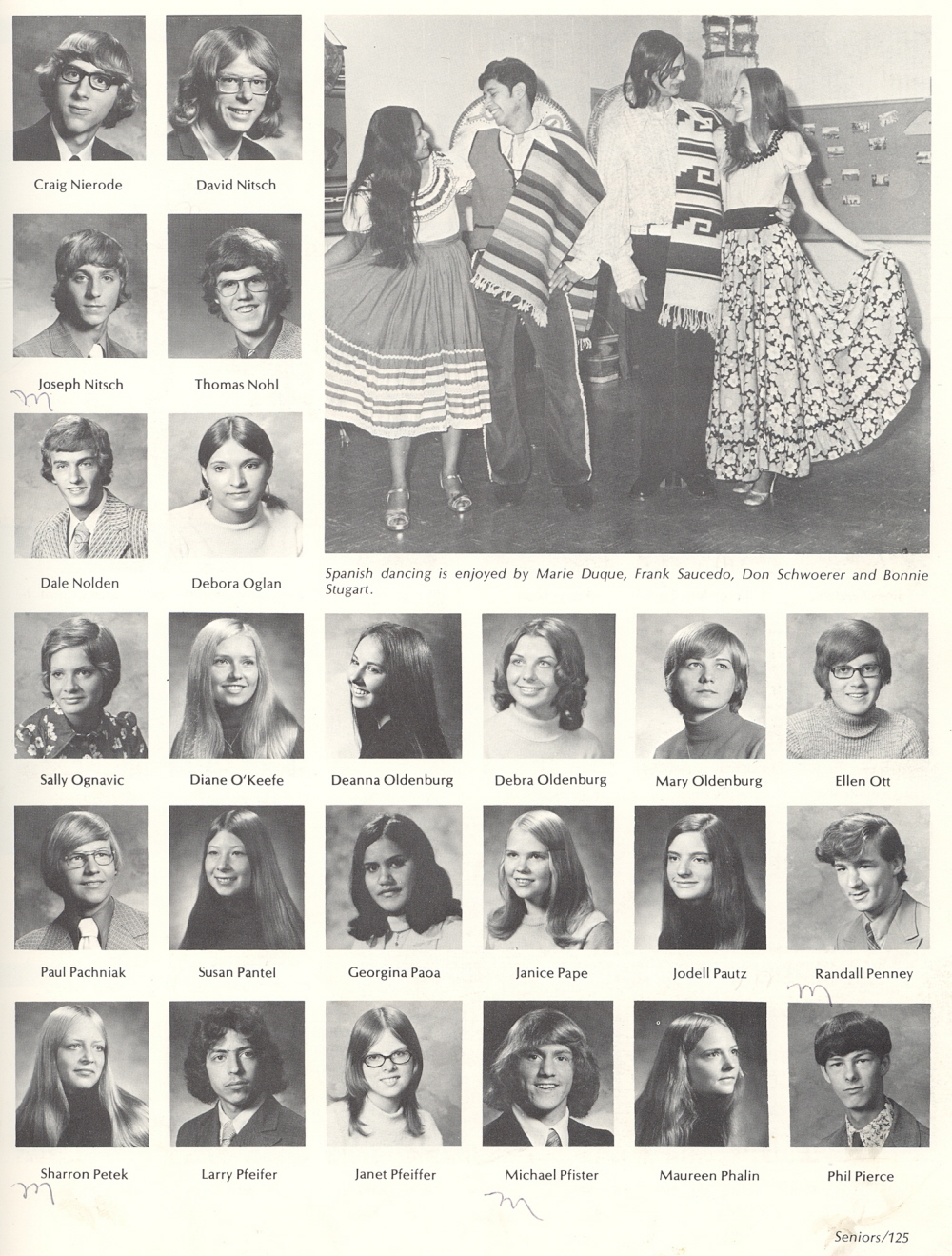 1974 Sheboygan South High School, Page 125: Craig Nierode, David Nitsch, Joseph Nitsch, Thomas Nohl, Dale Nolden, Debora Oglan, Sally Ognavic, Diane O'Keefe, Deanna Oldenburg, Debra Oldenburg, Mary Oldenburg, Ellen Ott, Paul Pachniak, Susan Pantel, Georgina Paoa, Janice Pape, Jodell Pautz, Randall Penney, Sharron Petek, Larry Pfeifer, Janet Pfeiffer, Michael Pfister, Maureen Phalen, Phil Pierce.