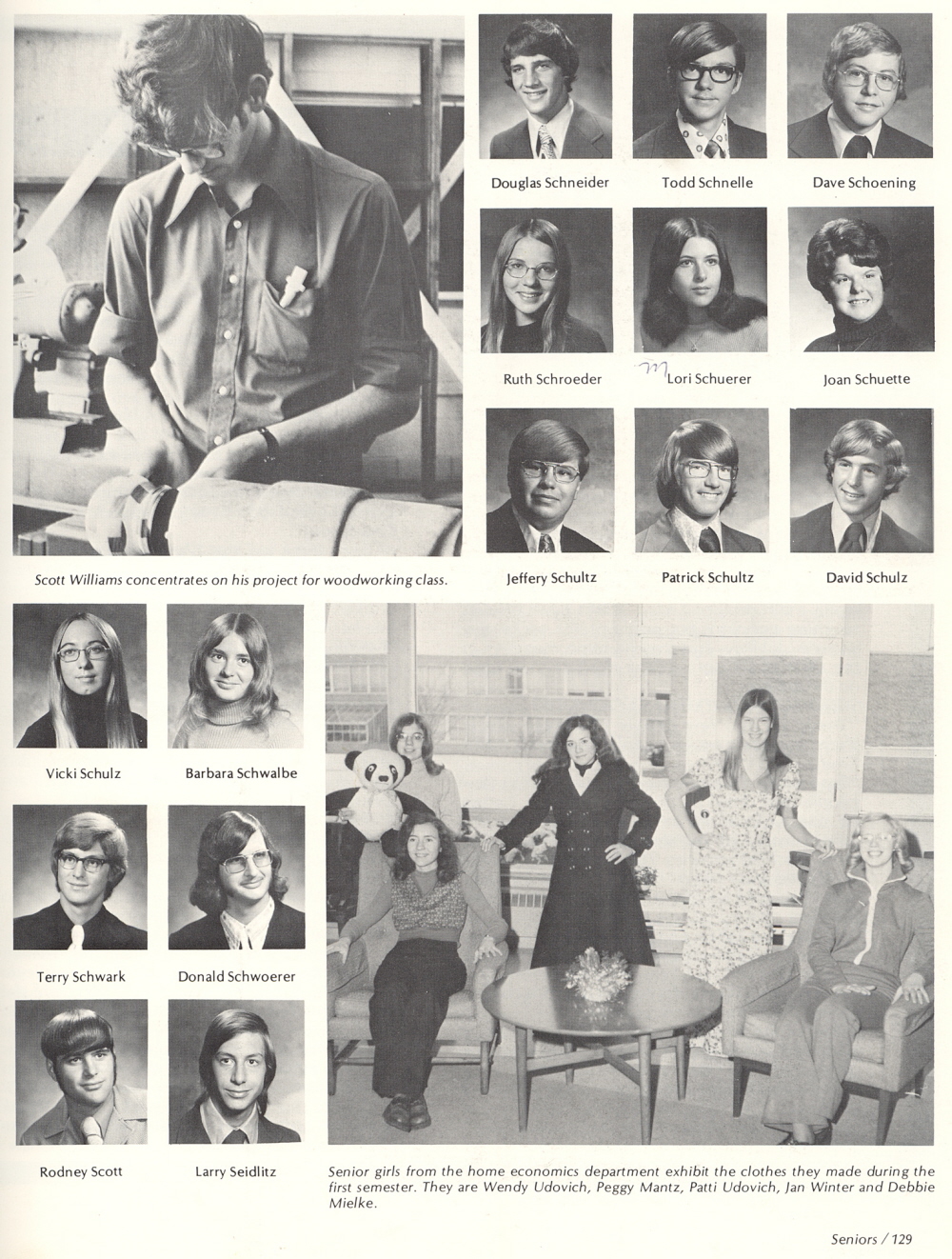 1974 Sheboygan South High School, Page 129: Douglas Schneider, Todd Schnelle, Dave Schoening, Ruth Schroeder, Lori Schuerer, Joan Schuette, Jeffery Schultz, Patrick Schultz, David Schulz, Vicki Schulz, Barbara Schwalbe, Terry Schwark, Donald Schwoerer, Rodney Scott, Larry Seidlitz.