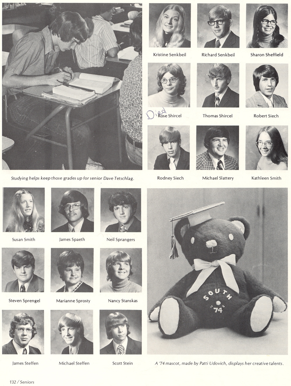 1974 Sheboygan South High School, Page 132: Kristine Senkbeil, Richard Senkbeil, Sharon Sheffield, Rose Shircel, Thomas Shircel, Robert Siech, Rodney Siech, Michael Slattery, Kathleen Smith, Susan Smith, James Spaeth, Neil Sprangers, Steven Sprengel, Marianne Sprosty, Nancy Stanskas, James Steffen, Michael Steffen, Scott Stein.