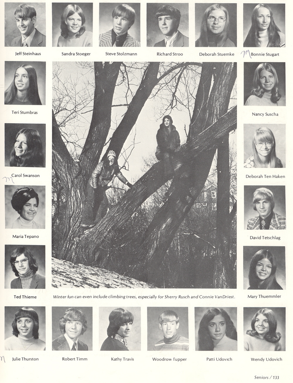 1974 Sheboygan South High School, Page 133: Jeff Steinhaus, Sandra Stoeger, Steve Stolzmann, Richard Stroo, Deborah Stuemke, Bonnie Stugart, Teri Stumbras, Nancy Suscha, Carol Swanson, Deborah Ten Haken, Maria Tepano, David Tetschlag, Ted Thieme, Mary Thuemmler, Julie Thurston, Robert Timm, Kathy Travis, Woodrow Tupper, Patti Udovich, Wendy Udovich.