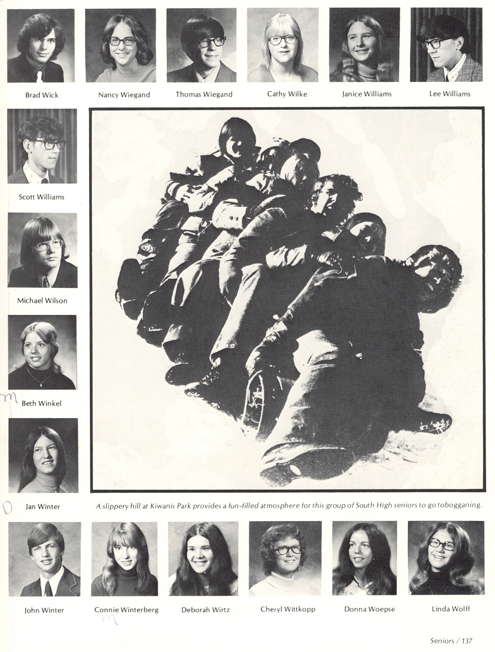 1974 Sheboygan South High School, Page 137: Brad Wick, Nancy Wiegand, Thomas Wiegand, Cathy Wilke, Janice Williams, Lee Williams, Scott Williams, Michael Wilson, Beth Winkel, Jan Winter, John Winter, Connie Winterberg, Deborah Wirtz, Cheryl Wittkopp, Donna Woepse, Linda Wolff.