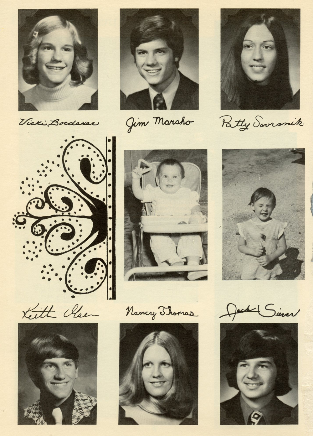1975 Kohler High School, Page 96: Vicki Boedeker, Jim Marsho, Patty Savrsnik, Keith Olsen, Nancy Thomas, Jack Siever.