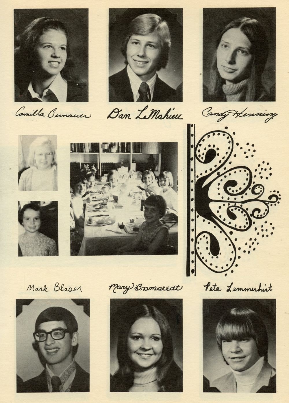 1975 Kohler High School, Page 99: Camilla Bernauer, Dan LeMahieu, Candy Henning, Mark Blaser, Mary Bramstedt, Pete Lemmerhirt.