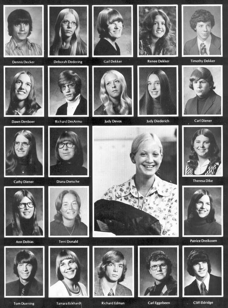 1975 Sheboygan North High School, Page 125: Dennis Decker, Deborah Dedering, Gail Dekker, Renee Dekker, Timothy Dekker, Dawn Denboer, Richard DesArmo, Judy Devos, Judy Diederich, Carl Diener, Cathy Diener, Diana Dietsche, Theresa Dike, Ann Dobias, Terri Donald, Patrice Dreikosen, Tom Duening, Tanara Eckhardt, Richard Edman, Carl Eggebeen, Cliff Eldridge.