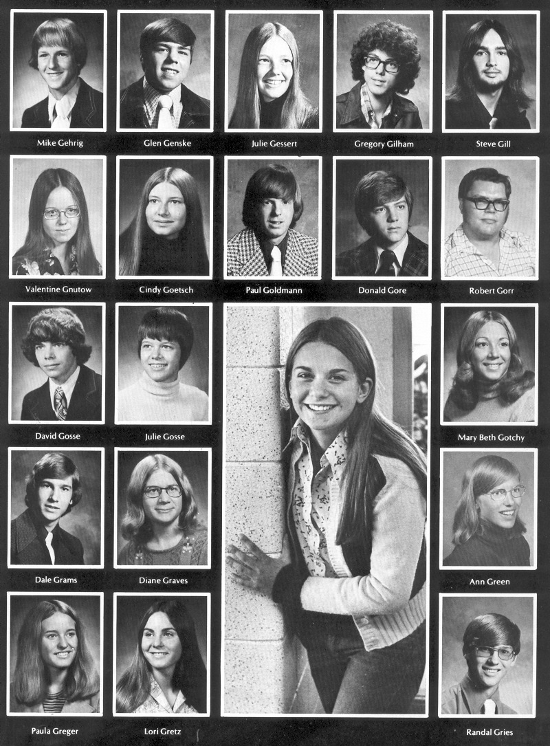 1975 Sheboygan North High School, Page 127: Mike Gehrig, Glen Genske, Julie Gessert, Gregory Gilham, Steve Gill, Valentine Gnutow, Cindy Goetsch, Paul Goldmann, Donald Gore, Robert Gorr, David Gosse, Julie Gosse, Mary Beth Gotchy, Dale Grams, Diane Graves, Ann Green, Paula Greger, Lori Gretz, Randal Gries.