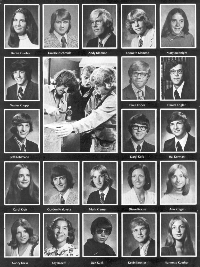 1975 Sheboygan North High School, Page 132: Karen Kisiolek, Tim Kleinschmidt, Andy Klemme, Kenneth Klemme, Marylou Knight, Walter Knopp, Dave Kober, Daniel Kogler, Jeff Kohlmann, Daryl Kolb, Hal Korman, Carol Kraft, Gordon Kralovetz, Mark Kramer, Diane Krause, Ann Kregel, Nancy Kress, Kay Kroeff, Dan Kuck, Kevin Kuester, Nannette Kuether.