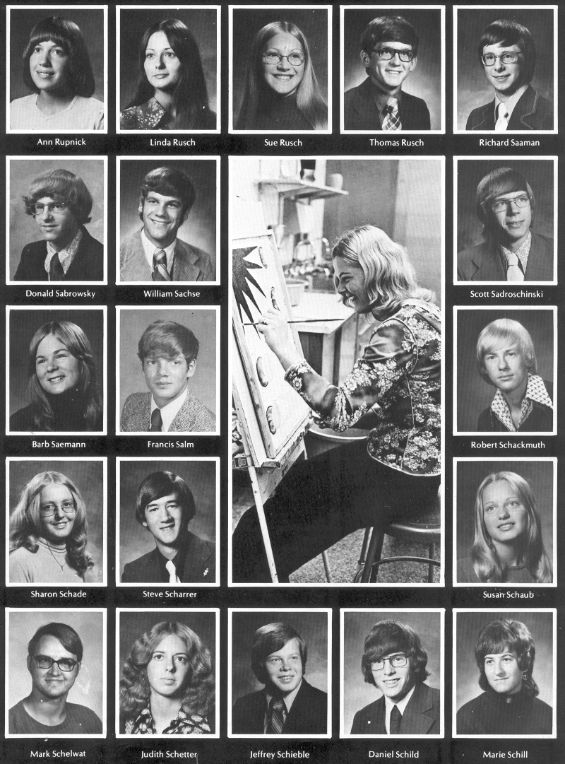 1975 Sheboygan North High School, Page 139: Ann Rupnick, Linda Rusch, Sue Rusch, Thomas Rusch, Richard Saaman, Donald Sabrowsky, William Sachse, Scott Sadroschinski, Barb Saemann, Francis Salm, Robert Schackmuth, Sharon Schade, Steve Scharrer, Susan Schaub, Mark Schelwat, Judith Schetter, Jeffrey Schieble, Daniel Schild, Marie Schill.