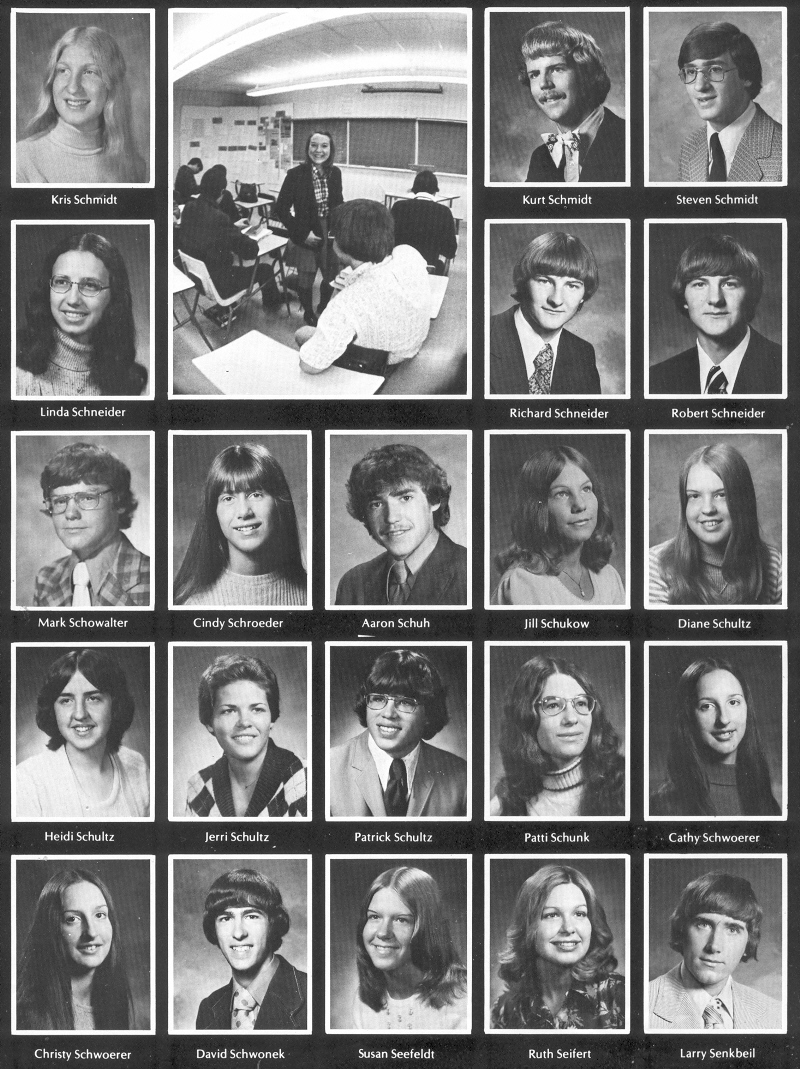 1975 Sheboygan North High School, Page 140: Kris Schmidt, Kurt Schmidt, Steven Schmidt, Linda Schneider, Richard Schneider, Robert Schneider, Mark Schowalter, Cindy Schroeder, Aaron Schuh, Jill Schukow, Diane Schultz, Heidi Schultz, Jerri Schultz, Patrick Schultz, Patti Schunk, Cathy Schwoerer, Christy Schwoerer, David Schwonek, Susan Seefeldt, Ruth Seifert, Larry Senkbeil.