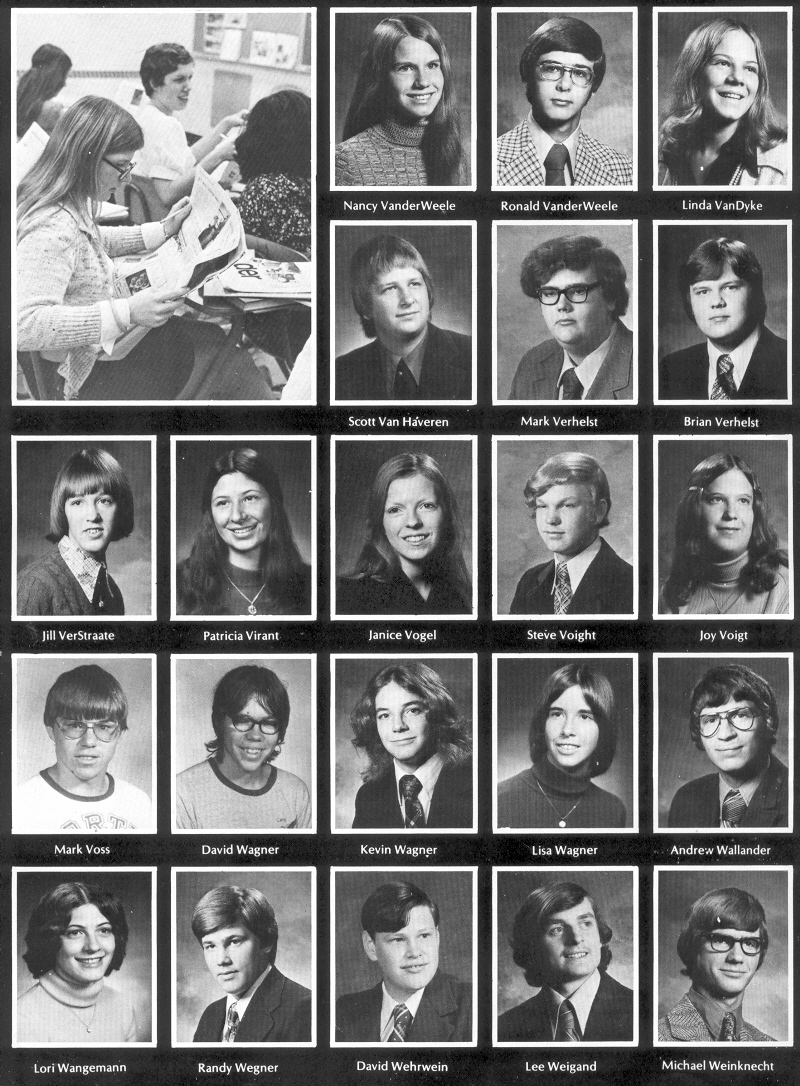 1975 Sheboygan North High School, Page 144: Nancy VanderWeele, Ronald VanderWeele, Linda VanDyke, Scott Van Haveren, Mark Verhelst, Brian Verhelst, Jill VerStraate, Patricia Virant, Janice Vogel, Steve Voight, Joy Voigt, Mark Voss, David Wagner, Kevin Wagner, Lisa Wagner, Andrew Wallander, Lori Wangemann, Randy Wegner, David Wehrwein, Lee Weigand, Michael Weinknecht.