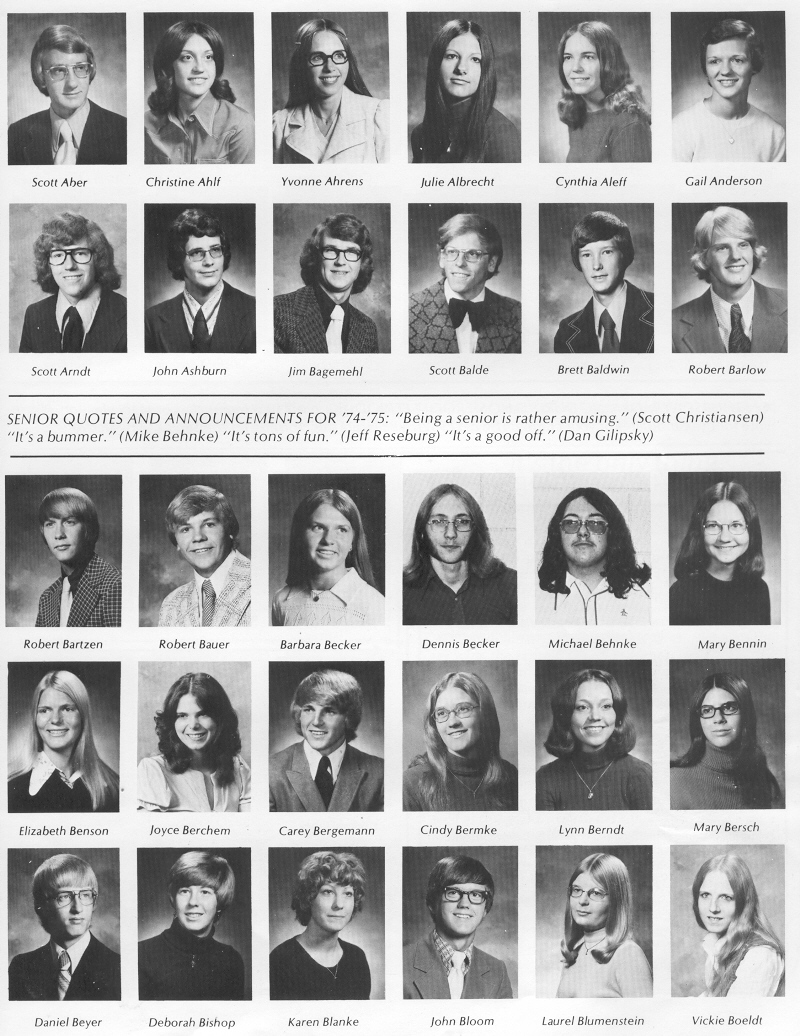1975 Sheboygan South High School, Page 111: Scott Aber, Christine Ahlf, Yvonne Ahrens, Julie Albrecht, Cynthia Aleff, Gail Anderson, Scott Arndt, John Ashburn, Jim Bagemehl, Scott Balde, Brett Baldwin, Robert Barlow, Robert Bartzen, Robert Bauer, Barbara Becker, Dennis Becker, Michael Behnke, Mary Bennin, Elizabeth Benson, Joyce Berchem, Carey Bergemann, Cindy Bermke, Lynn Berndt, Mary Bersch, Daniel Beyer, Deborah Bishop, Karen Blanke, John Bloom, Laurel Blumenstein, Vickie Boeldt.