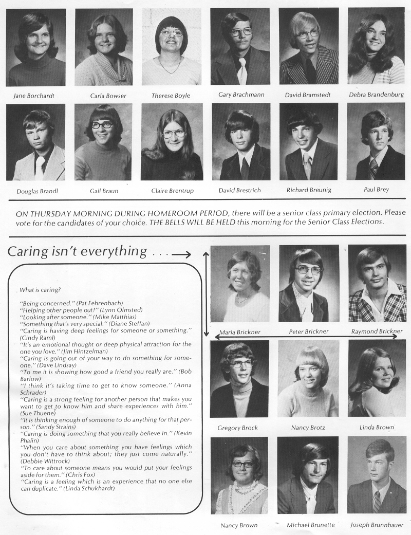 1975 Sheboygan South High School, Page 112: Jane Borchardt, Carla Bowser, Therese Boyle, Gary Brachmann, David Bramsteadt, Debra Brandenburg, Douglas Brandl, Gail Braun, Claire Brentrup, David Brestrich, Richard Breunig, Paul Brey, Maria Brickner, Peter Brickner, Raymond Brickner, Gregory Brock, Nancy Brotz, Linda Brown, Nancy Brown, Michael Brunette, Joseph Brunnbauer.