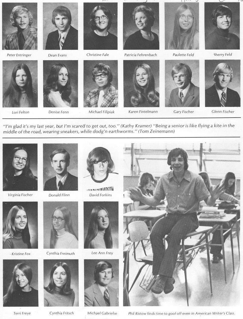 1975 Sheboygan South High School, Page 115: Peter Entringer, Dean Evans, Christine Fale, Patricia Fehrenbach, Paulette Feld, Sherry Feld, Lori Felton, Denise Fenn, Michael Filipiak, Karen Fintelmann, Gary Fischer, Glenn Fischer, Virginia Fischer, Donald Flinn, David Forkins, Kristine Fox, Cynthia Freimuth, Lee Ann Frey, Terri Freye, Cynthia Fritsch, Michael Gabrielse.