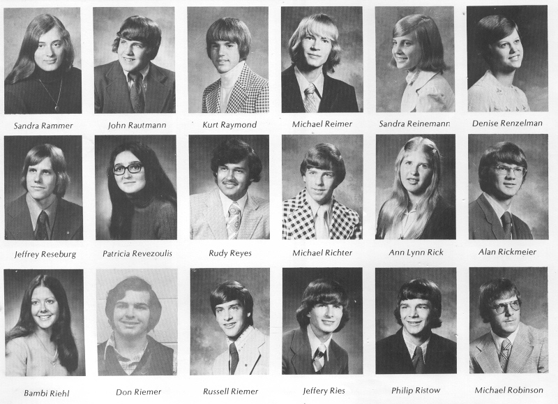1975 Sheboygan South High School, Page 128: Sandra Rammer, John Rautmann, Kurt Raymond, Michael Reimer, Sandra Reinemann, Denise Renzelman, Jeffrey Reseburg, Patricia Revezoulis, Rudy Reyes, Michael Richter, Ann Rick, Alan Rickmeier, Bambi Reihl, Don Riemer, Russell Riemer, Jeffrey Ries, Philip Ristow, Michael Robinson.