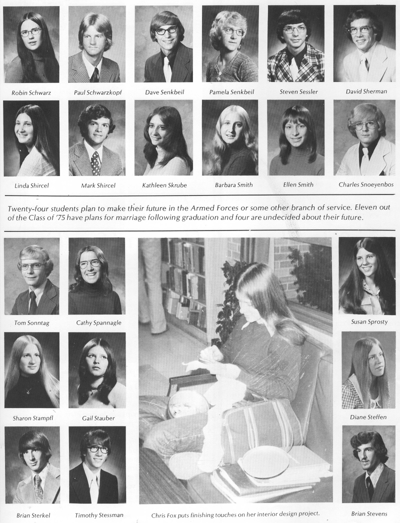 1975 Sheboygan South High School, Page 131: Robin Schwatz, Paul Schwarzkopf, Dave Senkbeil, Pamela Senkbeil, Steven Sessler, David Sherman, Linda Shircel, Mark Shircel, Kathleen Skrube, Barbara Smith, Ellen Smith, Charles Snoeyenbos, Tom Sonntag, Cathy Spannagle, Susan Sprosty, Sharon Stampfl, Gail Stauber, Diane Steffen, Brian Sterkel, Timothy Stessman, Brian Stevens.
