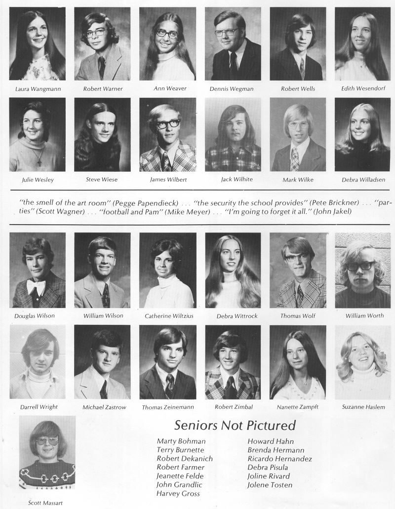 1975 Sheboygan South High School, Page 134: Laura Wangemann, Robert Warner, Ann Weaver, Dennis Wegman, Robert Wells, Edith Wesendorf, Julie Wesley, Steve Wiese, James Wilbert, Jack Wilhite, Mark Wilke, Debra Willadsen, Douglas Wilson, William Wilson, Catherine Wiltzius, Debra Wittrock, Thomas Wolf, William Worth, Darrell Wright, Michael Zastrow, Thomas Zeinemann, Robert Zimbal, Nanette Zampft, Suzanne Haslem, Scott Massart, Marty Bohman, Terry Burnette, Robert Dekanich, Robert Farmer, Jeanette Felde, John Grandlic, Harvey Gross, Howard Hahn, Brenda Hermann, Ricardo Hernandez, Debra Pisula, Joline Rivard, Jolene Tosten.