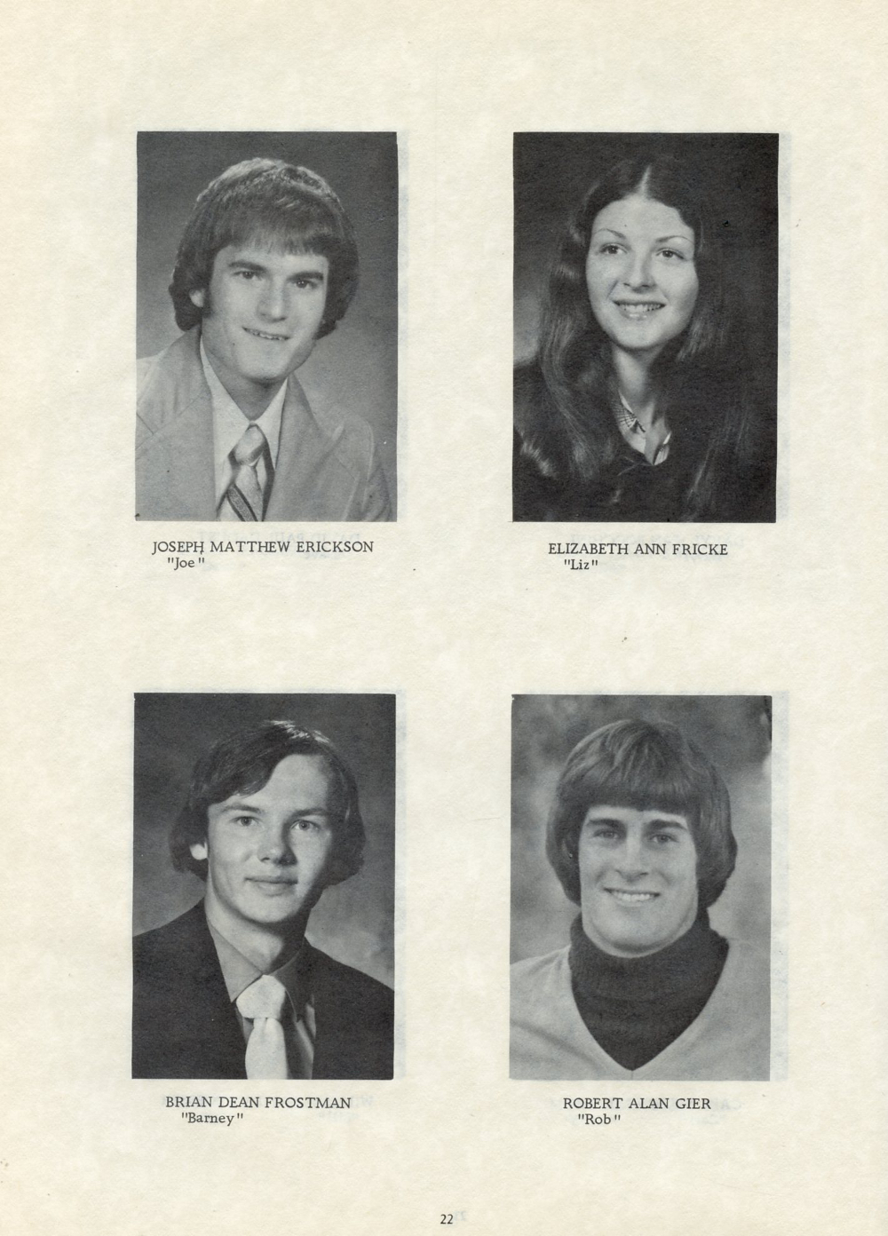 1976 Kohler High School, Page 22: Joseph Matthew Erickson, Elizabeth Ann Fricke, Brian Dean Frostman, Robert Alan Gier.