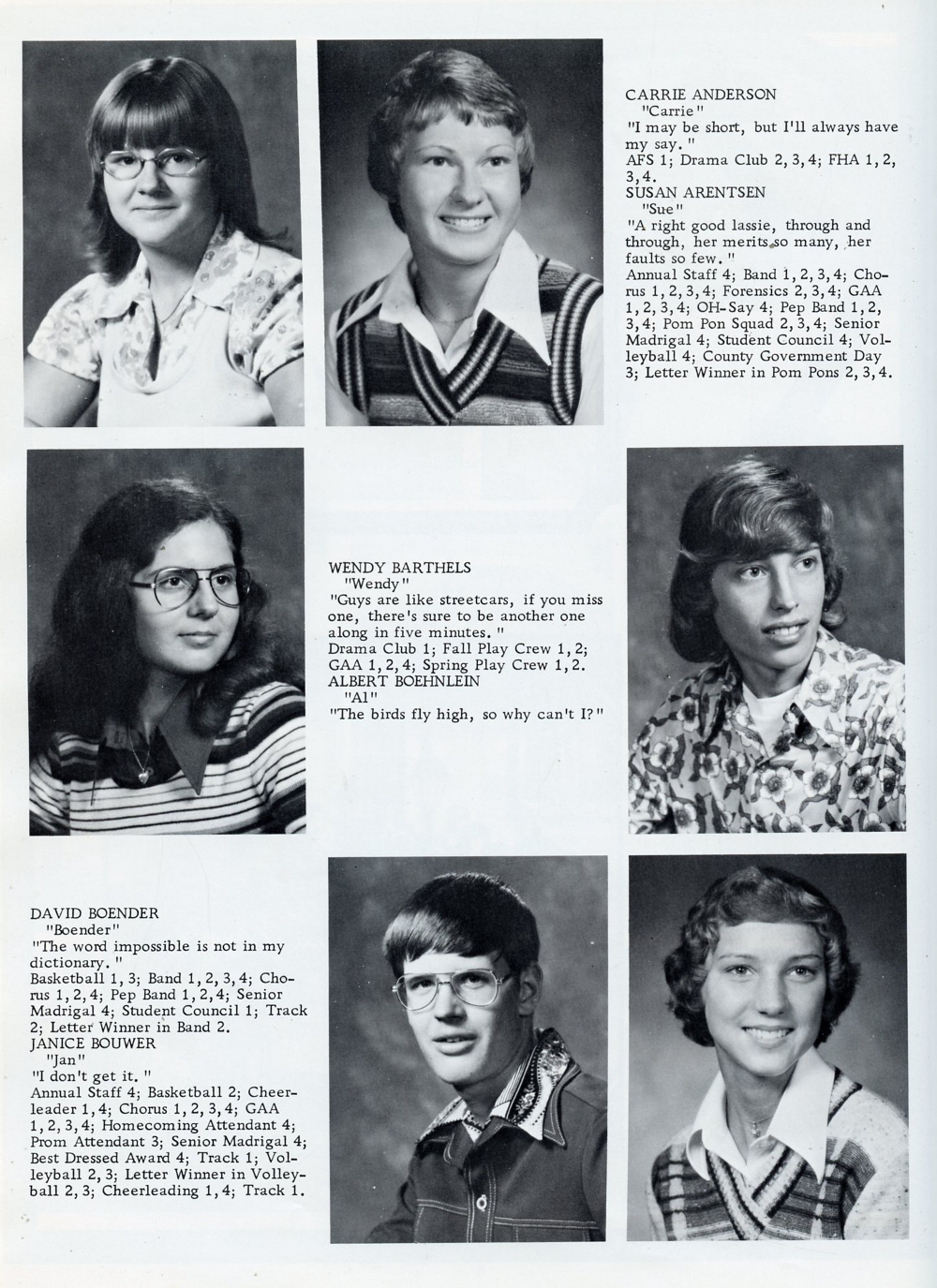 1976 Oostburg High School, Page 10: Carrie Anderson, Susan Arentsen, Wendy Barthels, Albert Boehnlein, David Boender, Janice Bouwer.