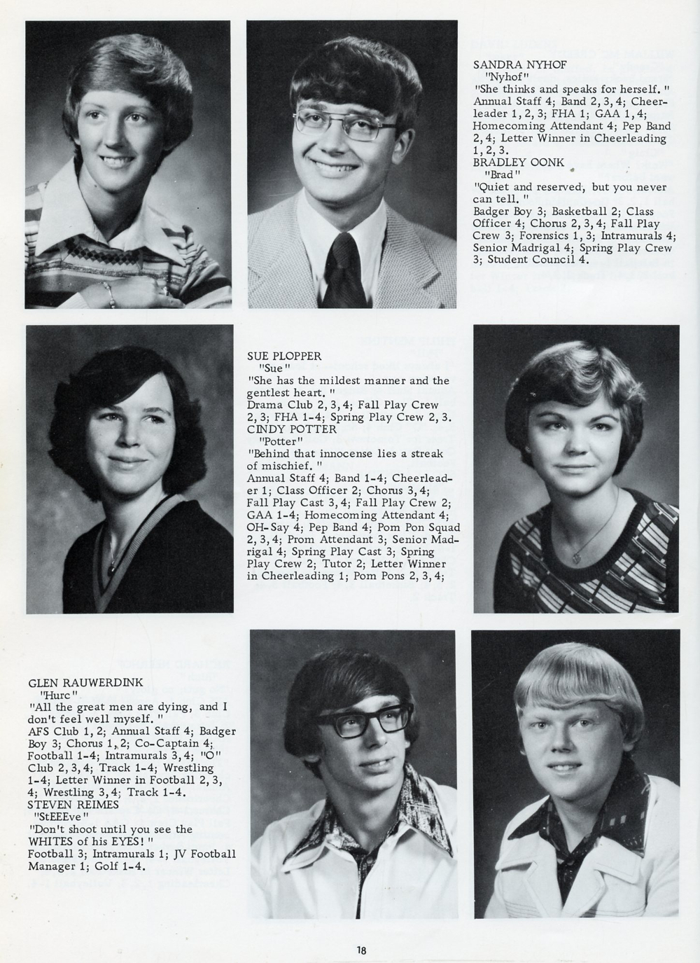 1976 Oostburg High School, Page 18: Sandra Nyhof, Bradley Oonk, Sue Plopper, Cindy Potter, Glen Rauwerdink, Steven Reimes.