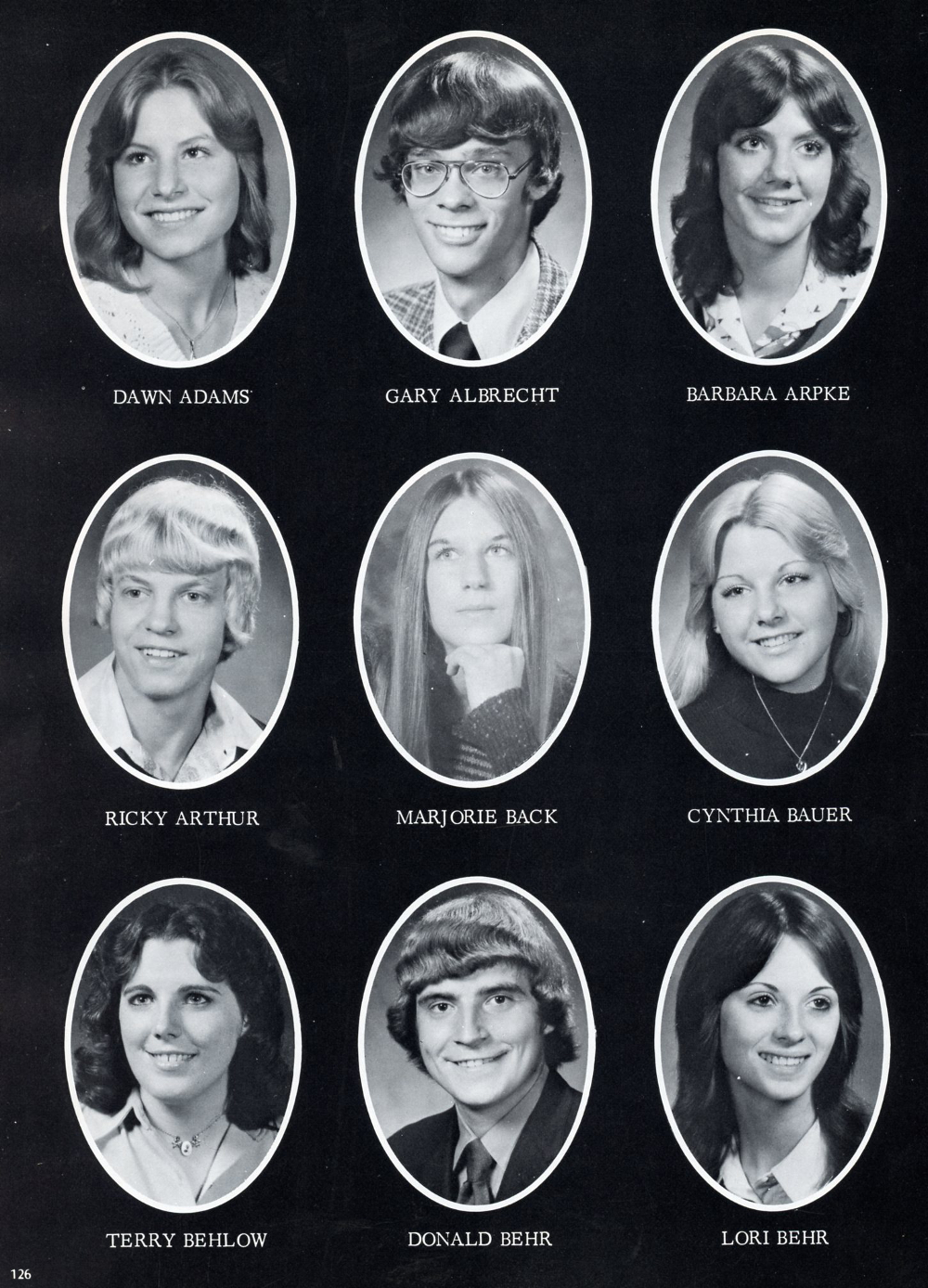 1976 Sheboygan Falls High School, Page 126: Dawn Adams, Gary Albrecht, Barbara Arpke, Ricky Arthur, Marjorie Back, Cynthia Bauer, Terry Behlow, Donald Behr, Lori Behr.