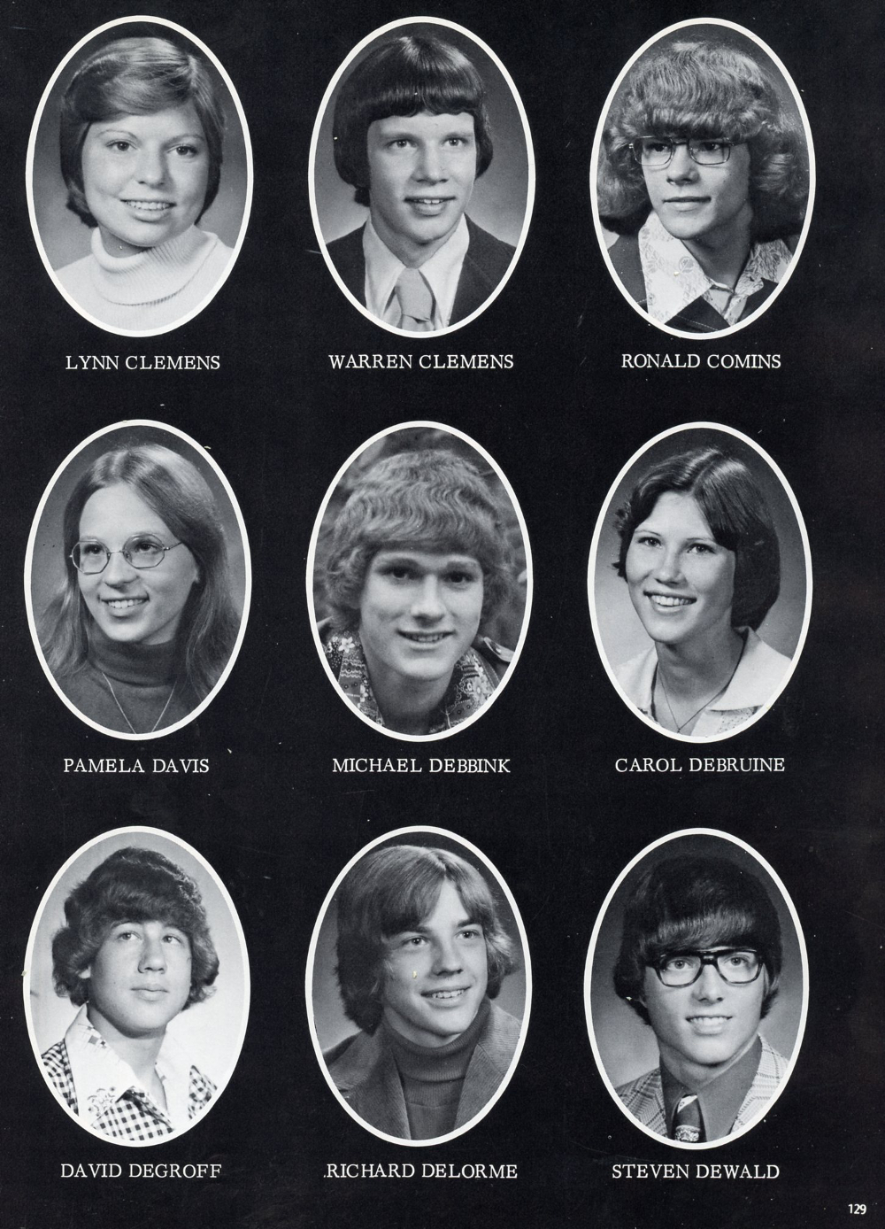 1976 Sheboygan Falls High School, Page 129: Lynn Clemens, Waren Clemens, Ronald Comins, Pamela Davis, Michael Debbink, Carol DeBruine, David DeGroff, Richard DeLorme, Steven Dewald.