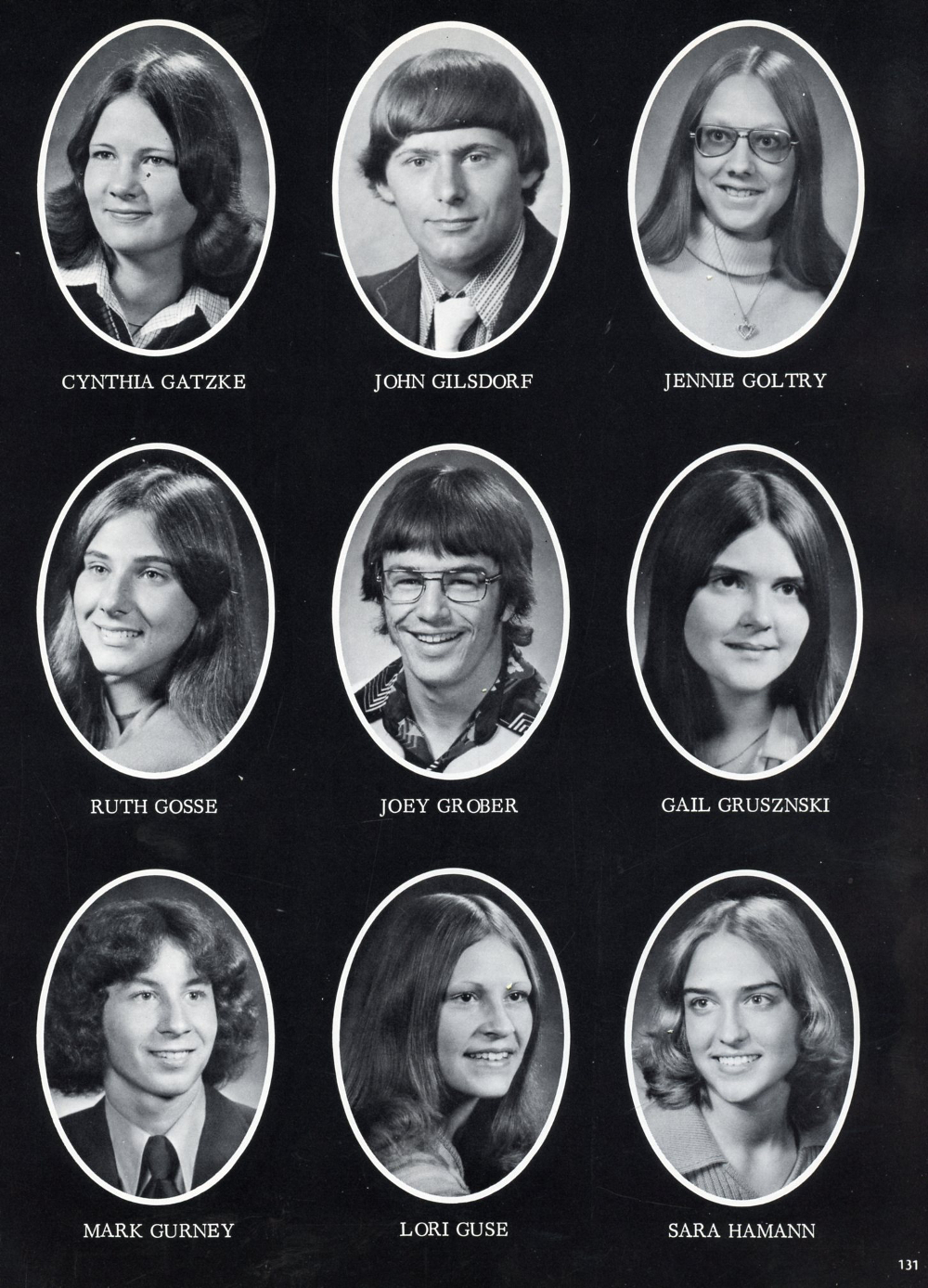 1976 Sheboygan Falls High School, Page 131: Cynthia Gatzke, John Gilsdorf, Jennie Goltry, Ruth Gosse, Joey Grober, Gail Grusznski, Mark Gurney, Lori Guse, Sara Hamann.