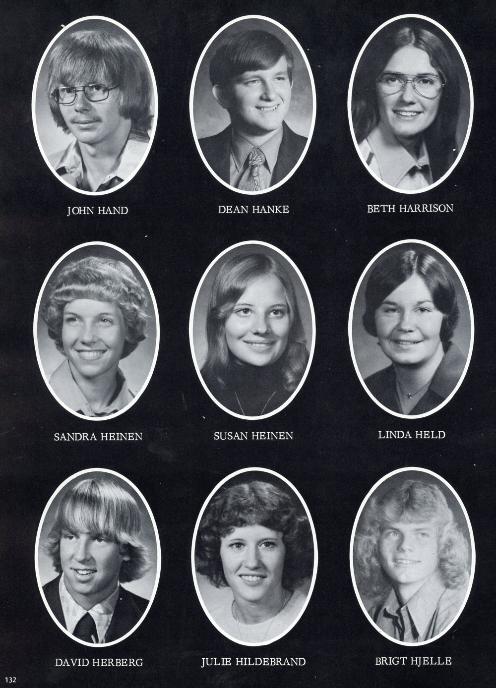 1976 Sheboygan Falls High School, Page 132: John Hand, Dean Hanke, Beth Harrison, Sandra Heinen, Susan Heinen, Linda Held, David Herberg, Julie Hildebrand, Brigt Hjelle.